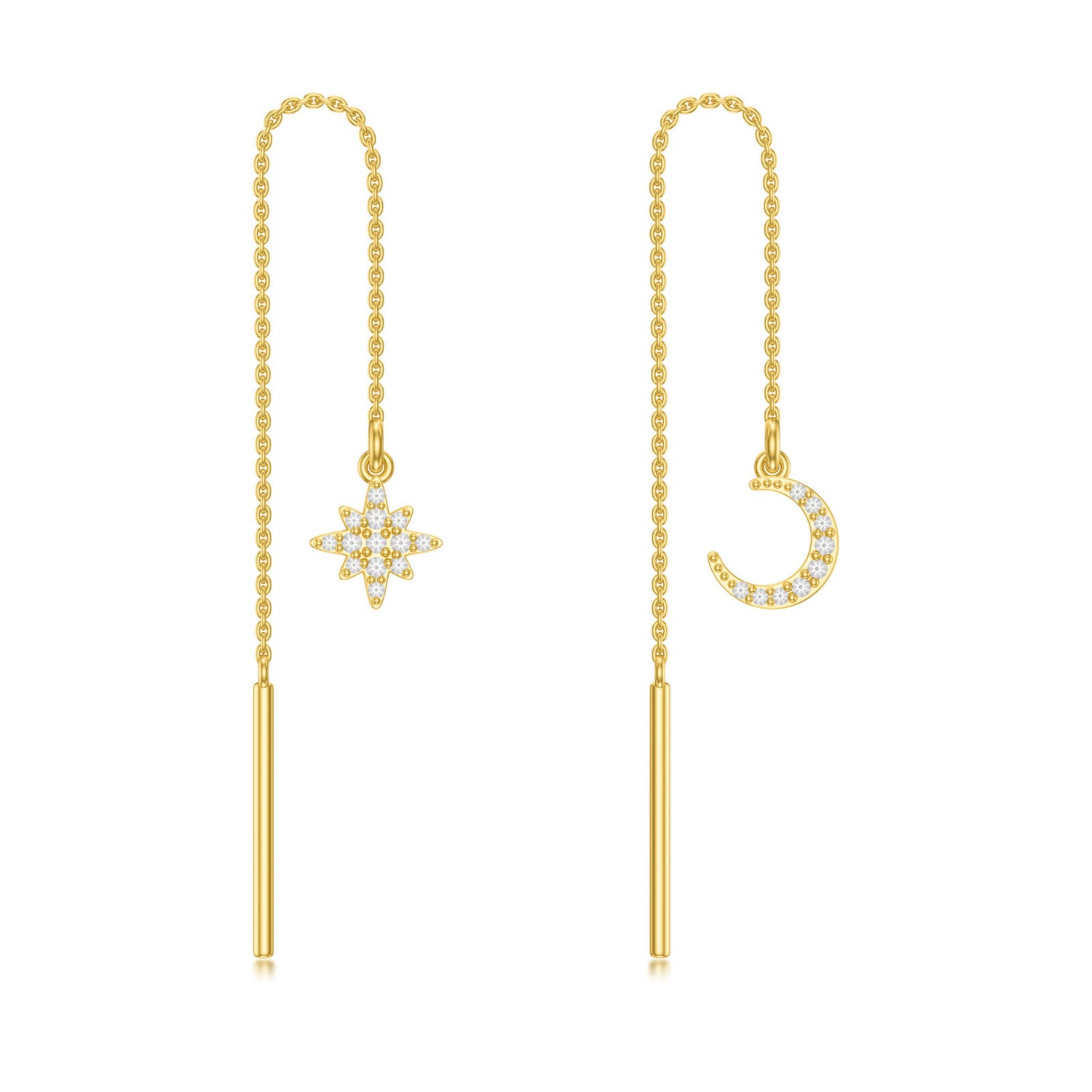 Crafted from luxurious 14K Gold, these Circular Shaped Drop Earrings are embellished with glistening Cubic Zirconia in a Moon and Star Motif.