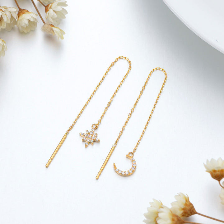 14K Gold Circular Shaped Cubic Zirconia Moon & Star Drop Earrings