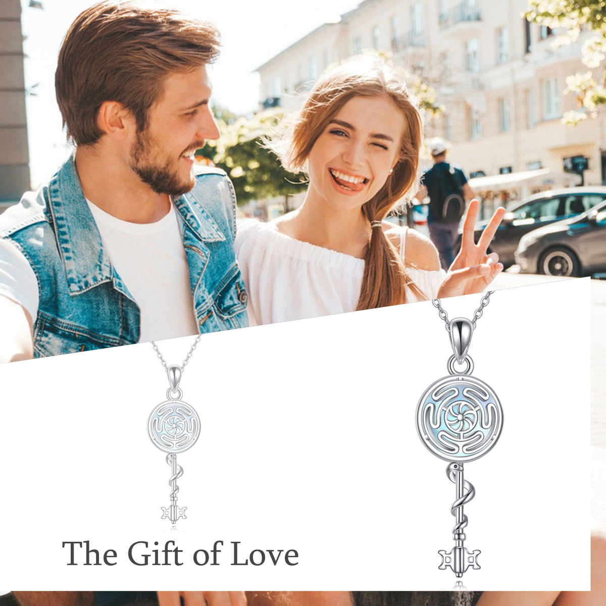 This Sterling Silver Circular Shaped Moonstone Snake & Key Pendant Necklace offers a touch of celestial elegance with mystique. The circular Moonstone shimmers with a captivating blue hue, while the unique Snake and Key designs add an element of intrigue. The White Gold Plated finish ensures this piece is a versatile, sophisticated accessory.