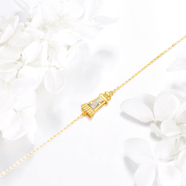 This 14K Gold Opal Lighthouse Charm Bracelet by YFN is an exquisite piece that captures understated elegance and nautical charm for women. This gorgeous 14K gold Charm bracelet features a stunning white opal in the shape of a lighthouse. The radiant opal shimmers with every movement, set in a meticulously crafted gold frame, offering both luxury and sophistication, making it a standout accessory for any occasion.
