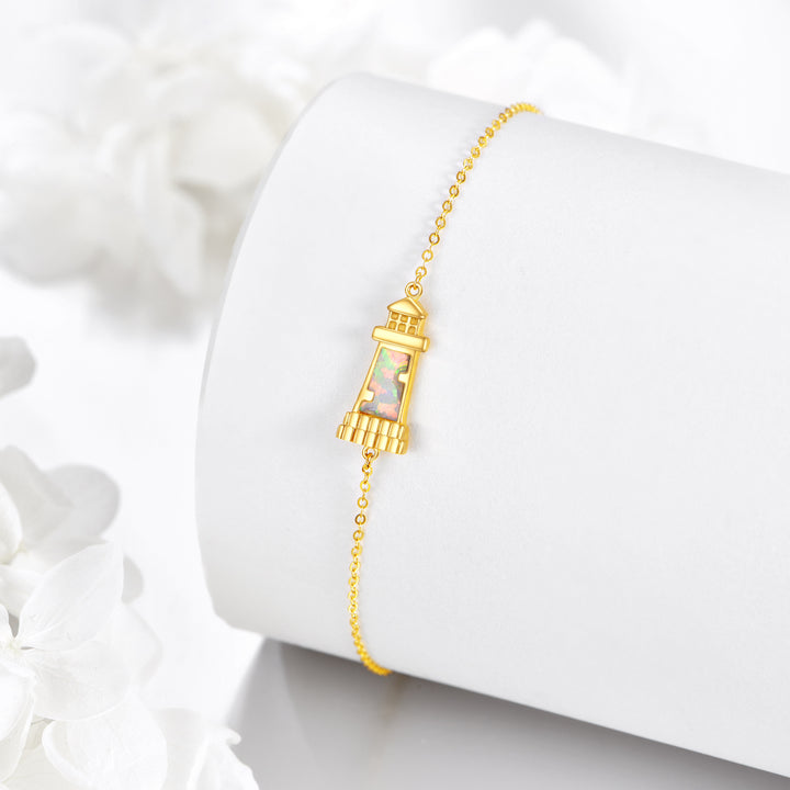 This Women's Charm Bracelet is crafted from 14K Gold, featuring a Lighthouse Charm Adorned with a Stunning White Opal.