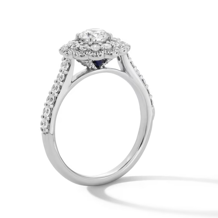 Crafted in 14K white gold featuring lab-created round diamonds (0.5–3 CT center; up to 3.5 CT T.W.), D color, VVS1–VS1 clarity, triple-excellent cut. IGI certified. Ring measurements per brand.