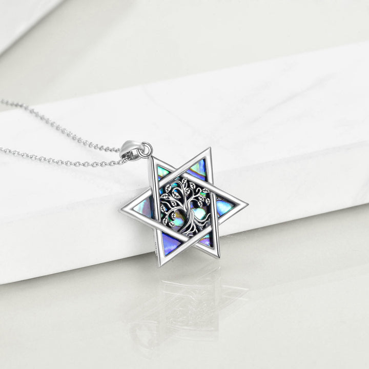 This Pendant Necklace is crafted from Sterling Silver with White Gold Plating, featuring Blue Abalone Shellfish, Tree of Life, and Star of David motifs.