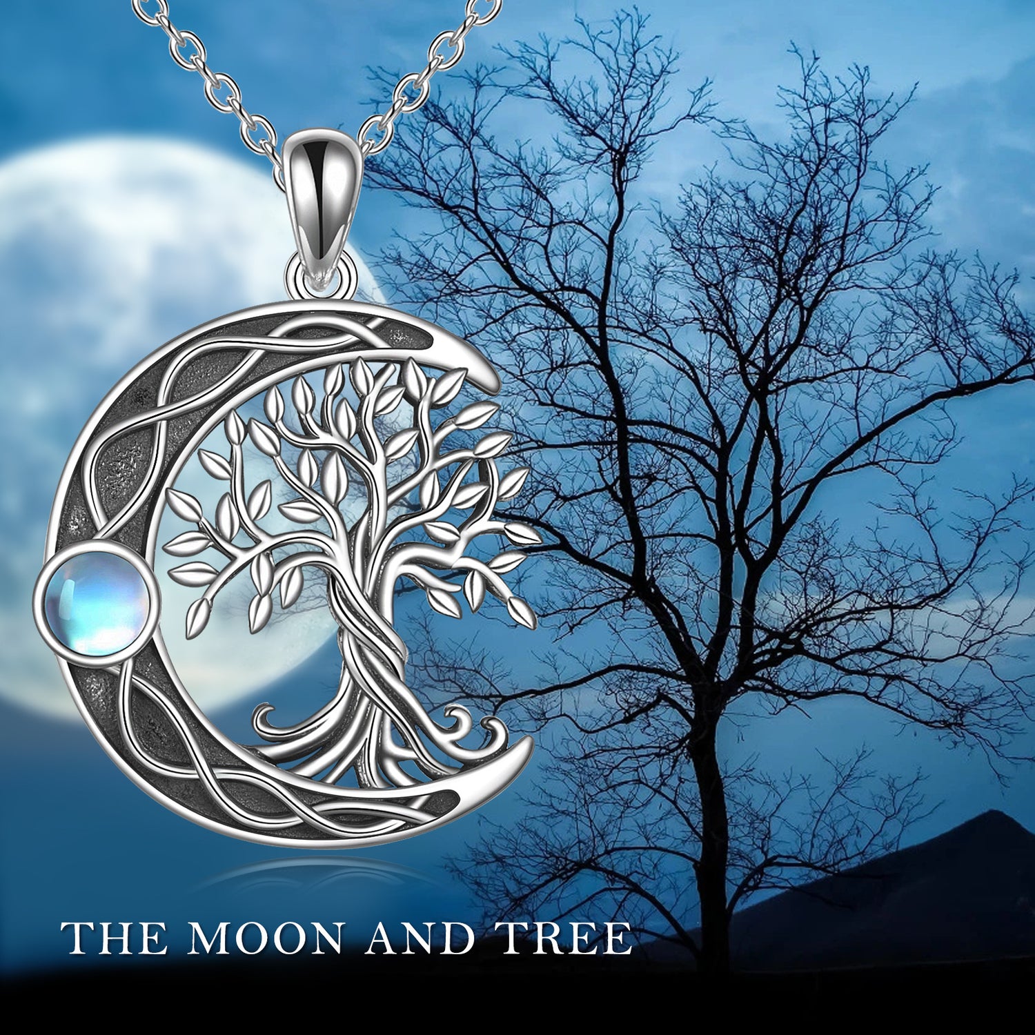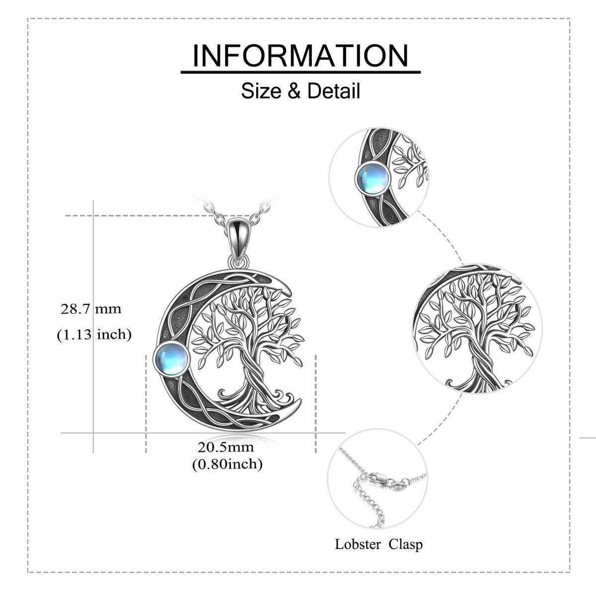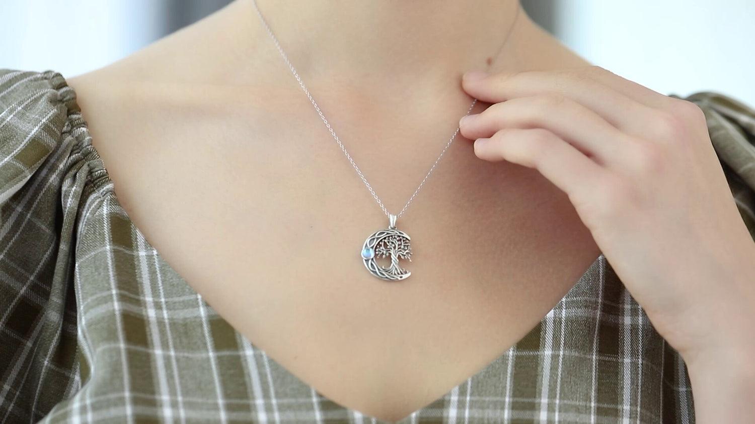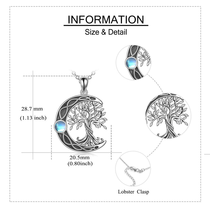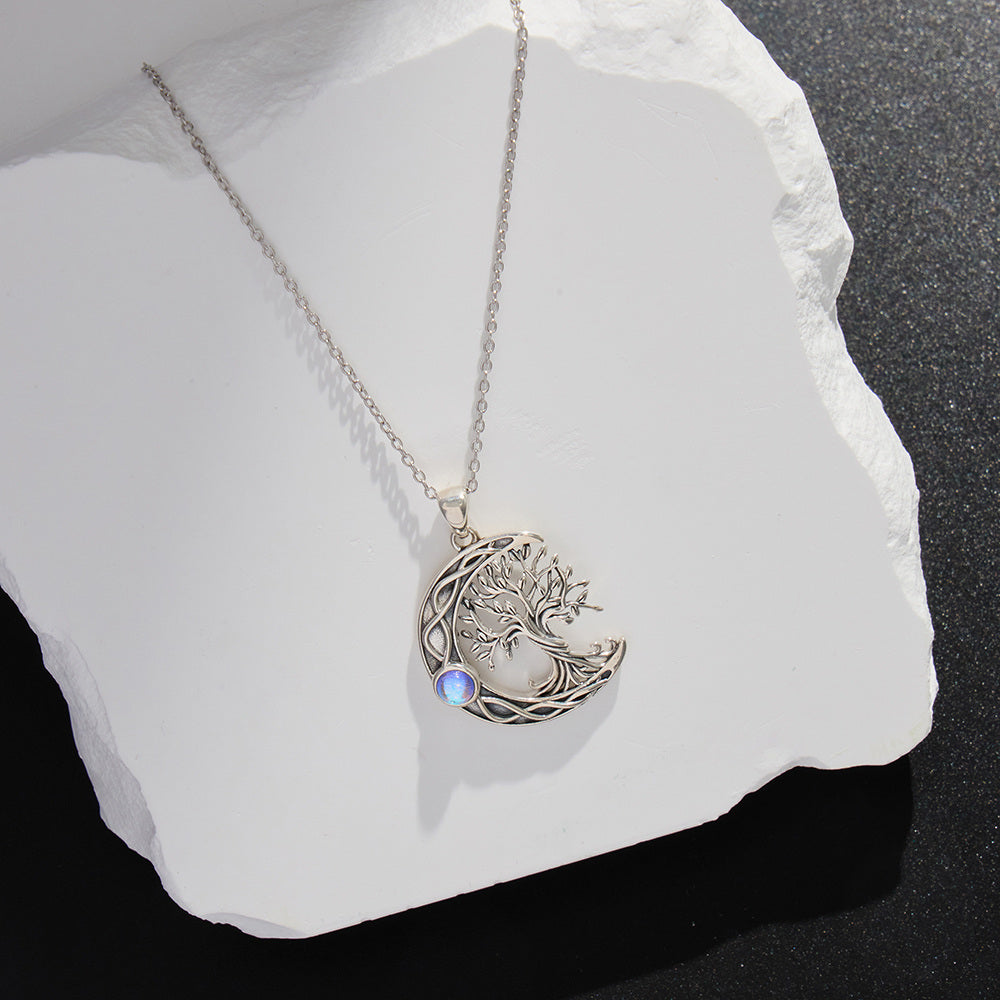 Crafted from Sterling Silver with an Oxidized Finish, featuring a Pendant Necklace with a Moonstone Centerpiece, Tree of Life, Celtic Knot, and Crescent Moon Symbols.