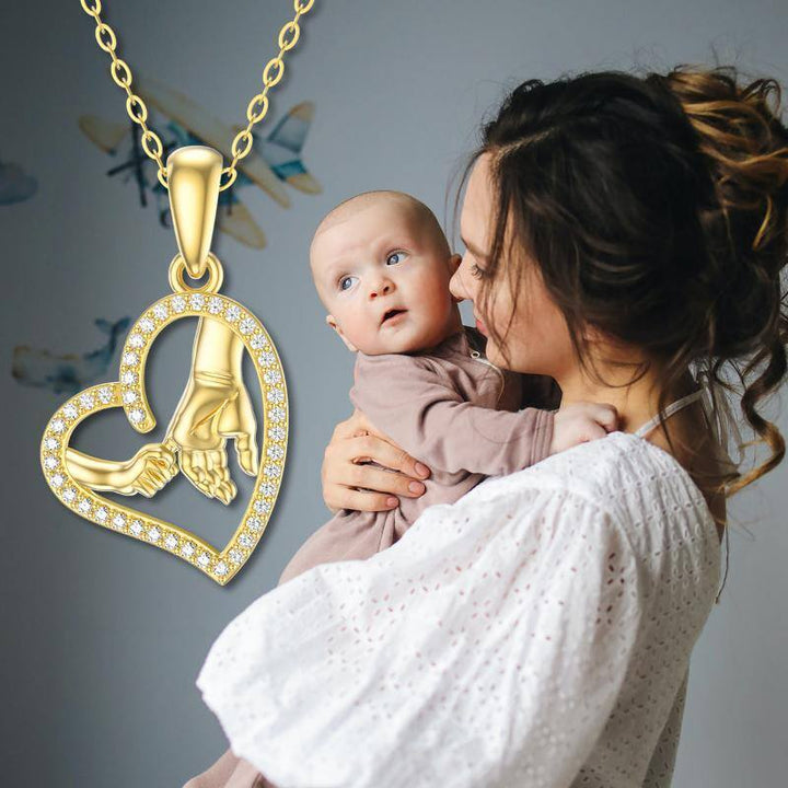 Crafted with high-quality 14K Gold, this Pendant Necklace features a Heart Motif with two Interlocking Hands, encrusted with dazzling Cubic Zirconia stones.