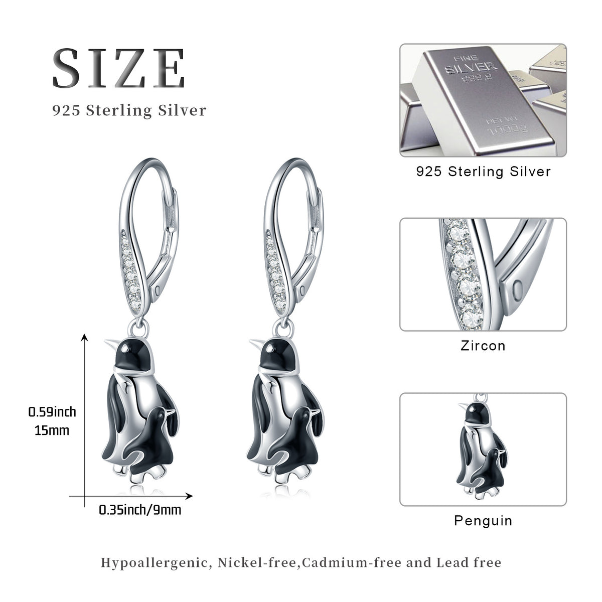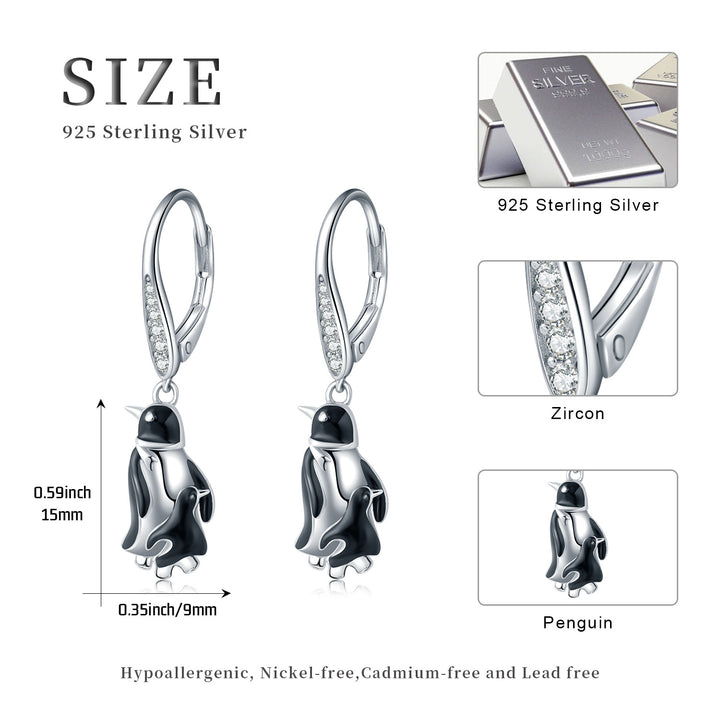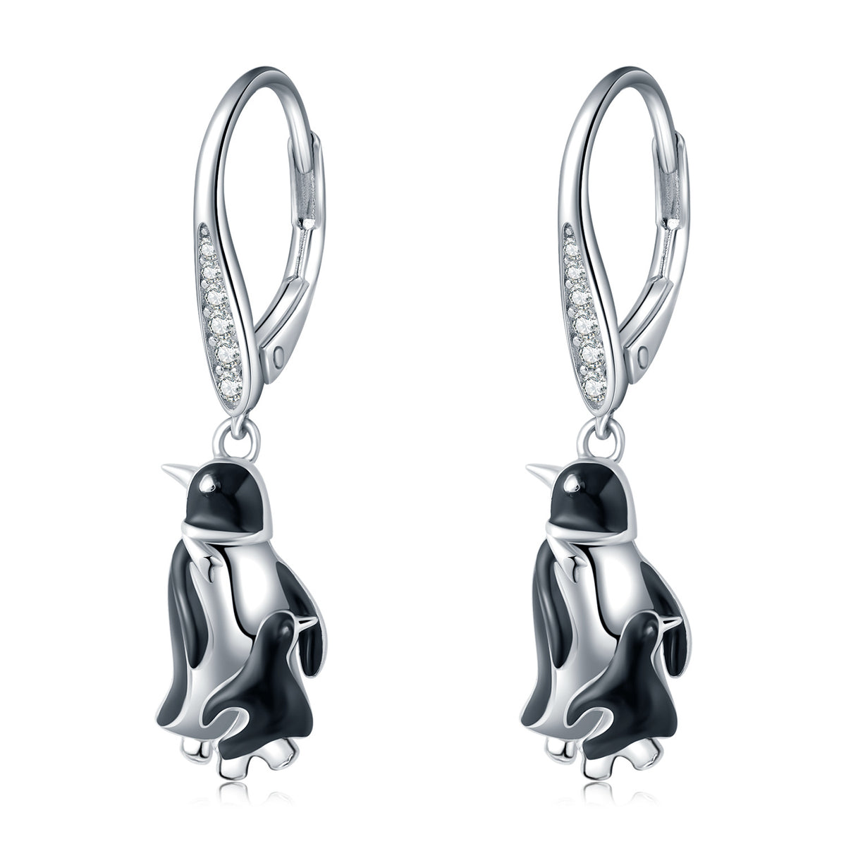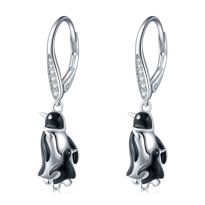 Sterling Silver Circular Shaped Cubic Zirconia Penguin Lever-back Earrings