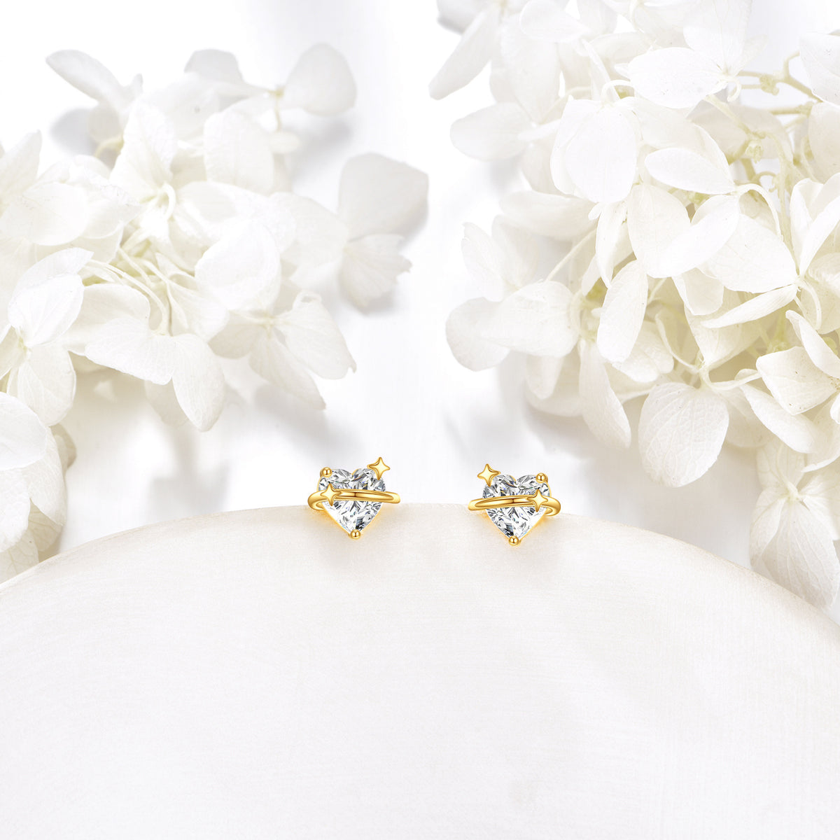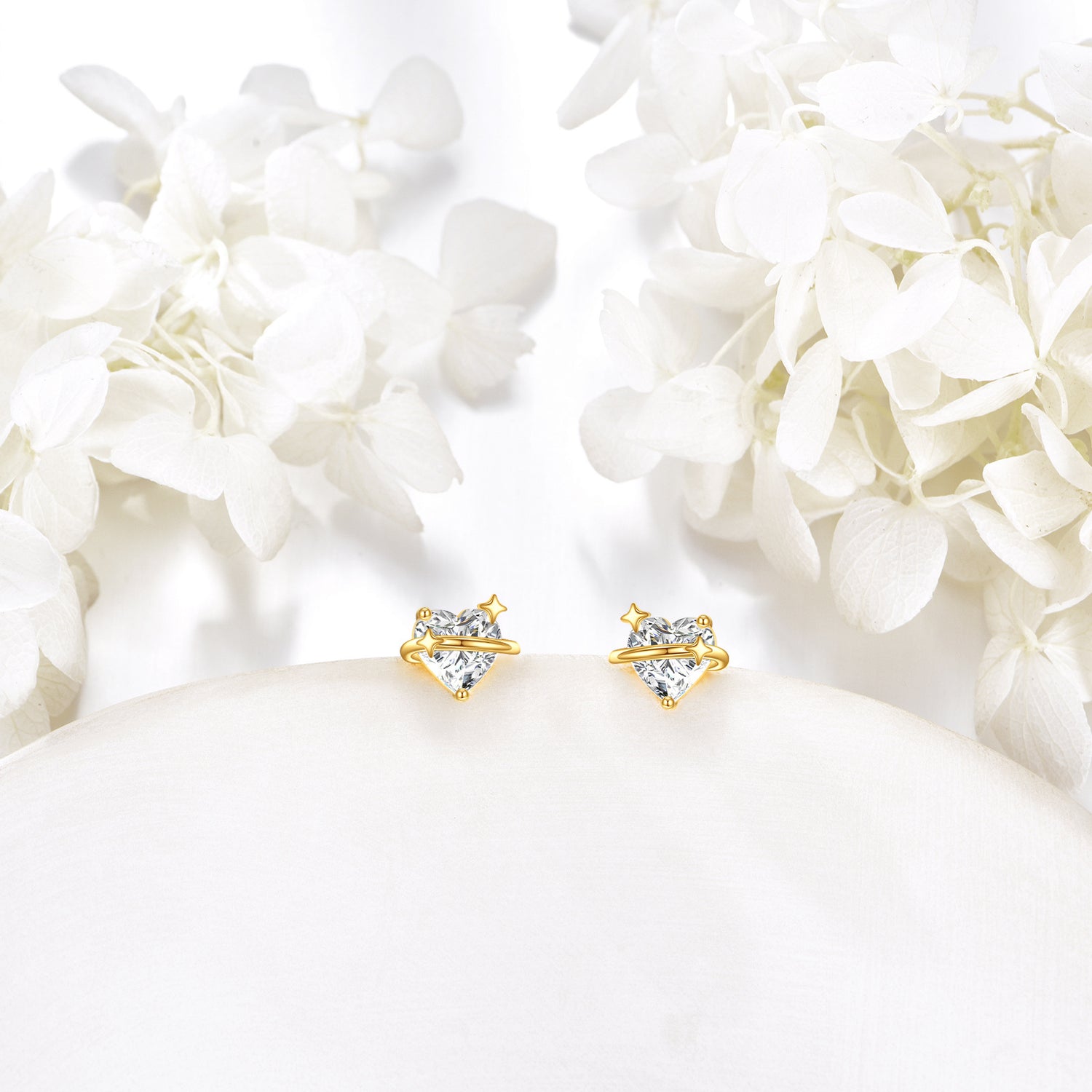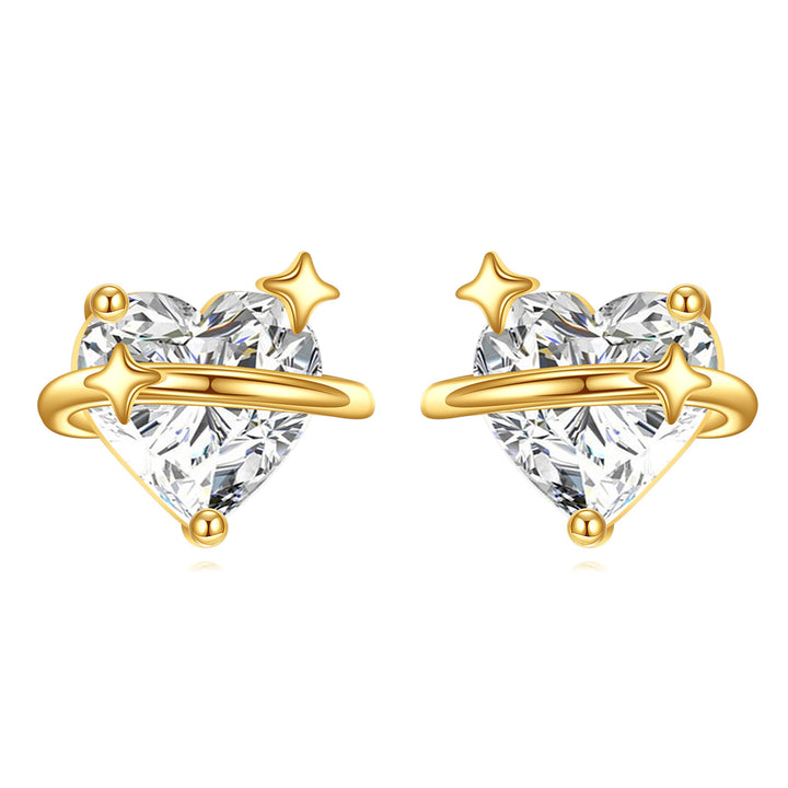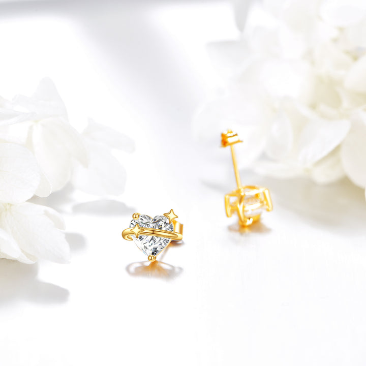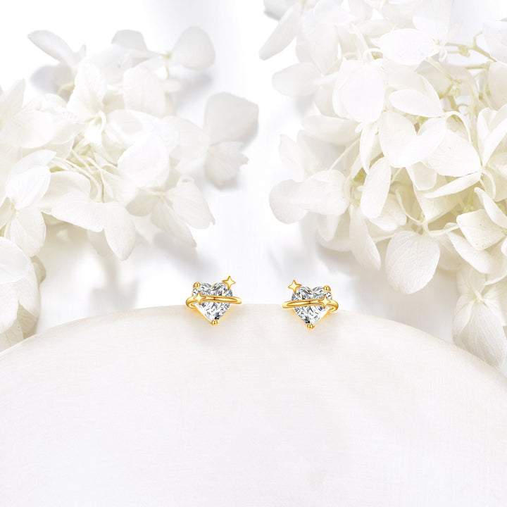 Handcrafted stud earrings made from 14K solid gold. Embellished with Moissanite gemstones shaped like hearts and stars.