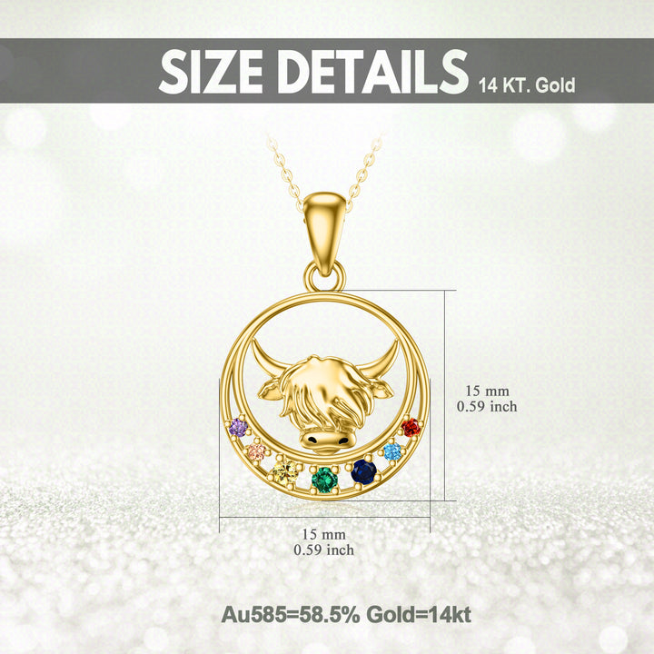 Pendant necklace crafted from solid 14K gold, circular shape. Features multiple round zircon stones in various colors. Motifs include Highland Cow, Chakras, and Moon. Pendant measures 0.90 inches by 0.70 inches on an 18-inch rolo chain with a spring-ring clasp.