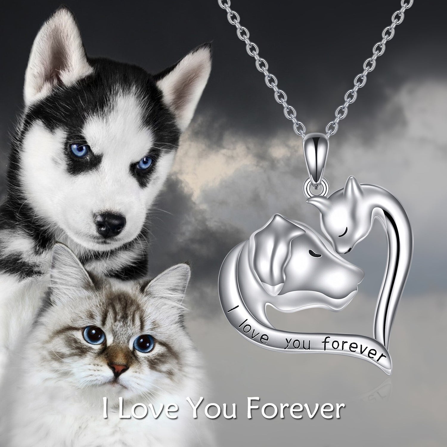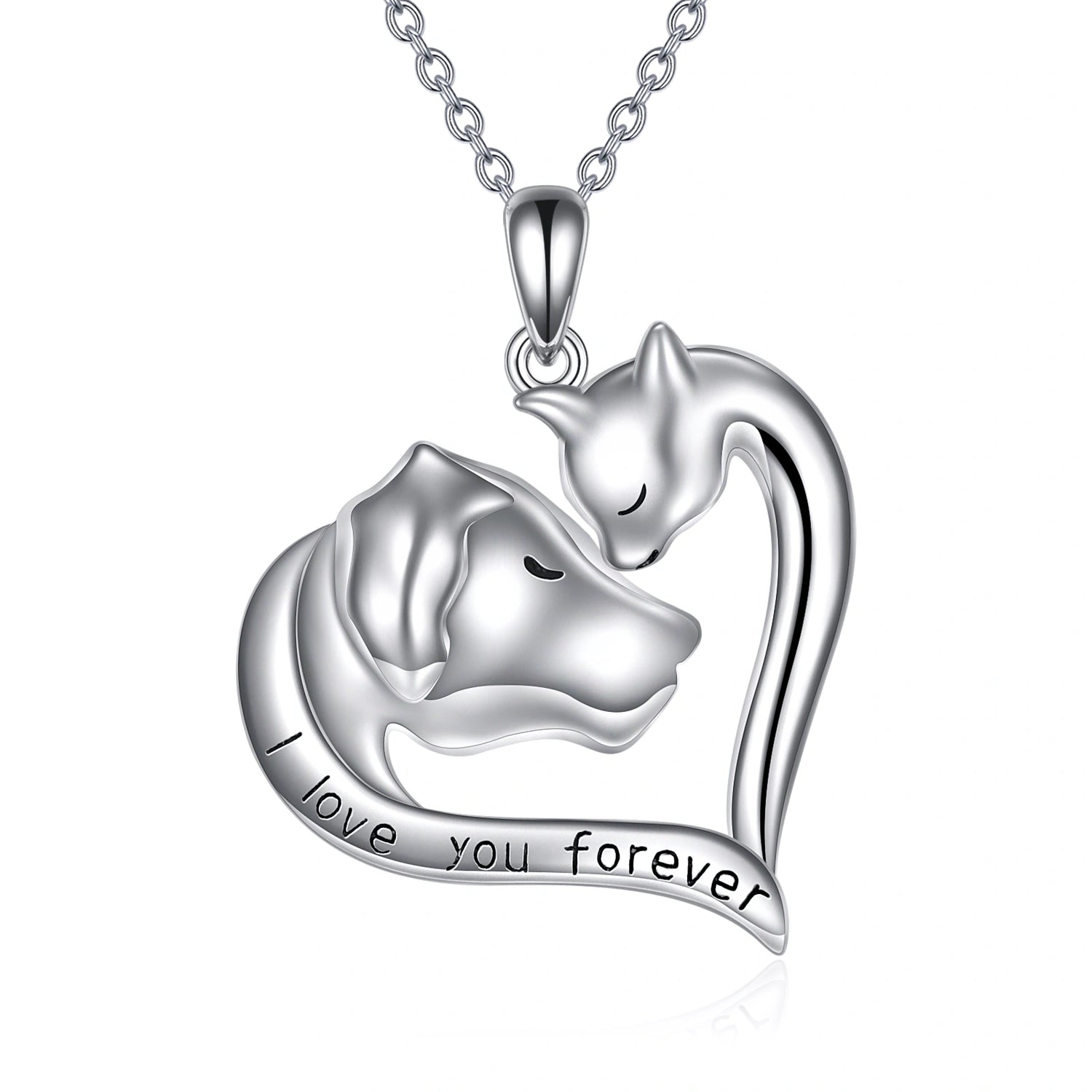 14K Gold Heart & Cat With Dog Pendant I Love You Forever Necklace For Women Men