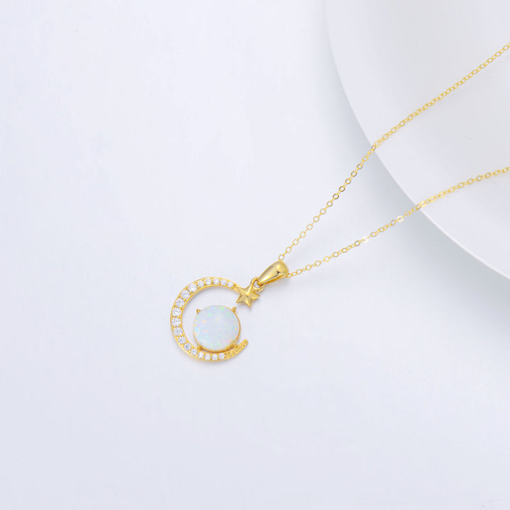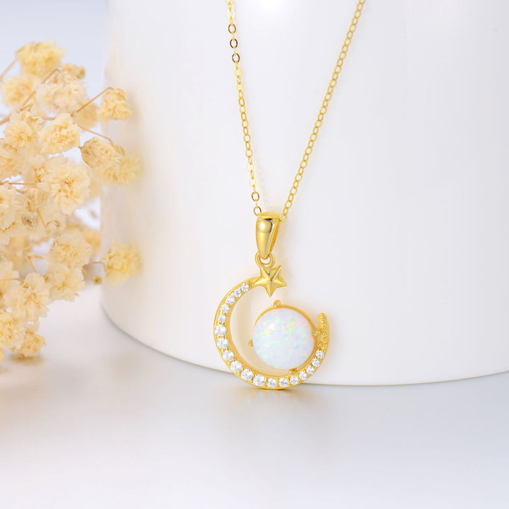 14K Gold Round Cubic Zirconia Opal Moon & Pentagram Pendant Necklace For Women Best Friends
