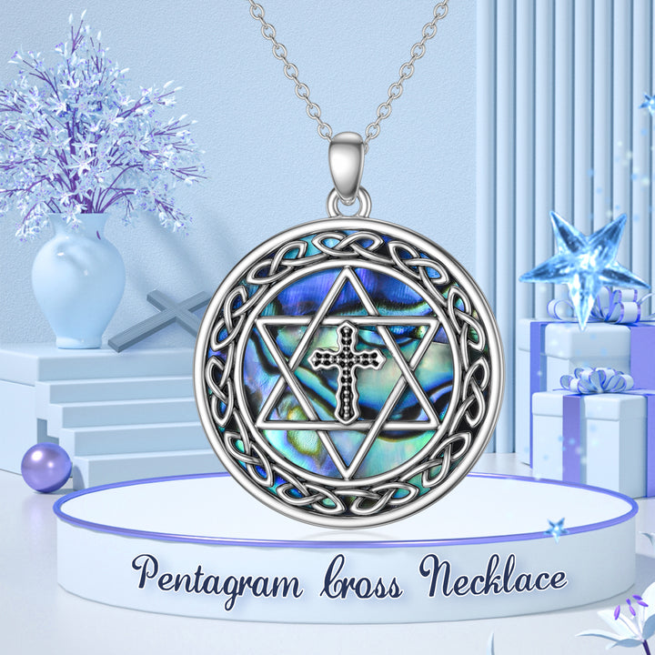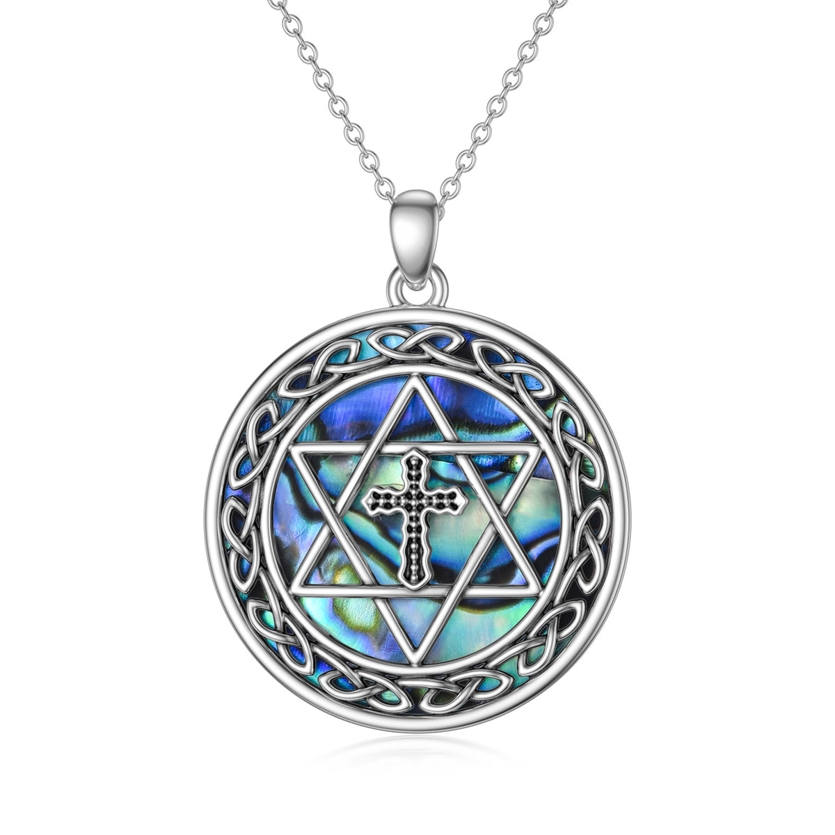 Sterling Silver Circular Shaped Abalone Shellfish Cross & Star Of David Pendant Necklace