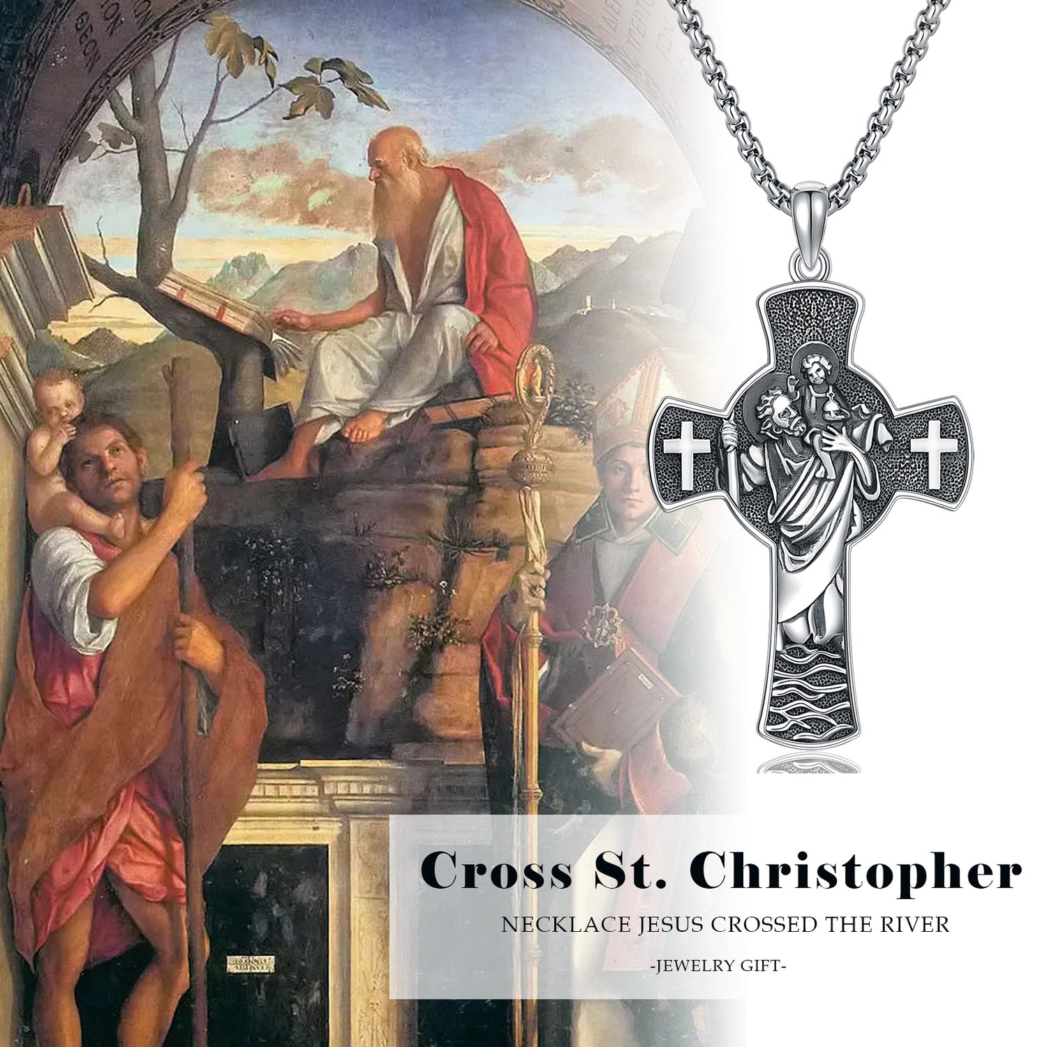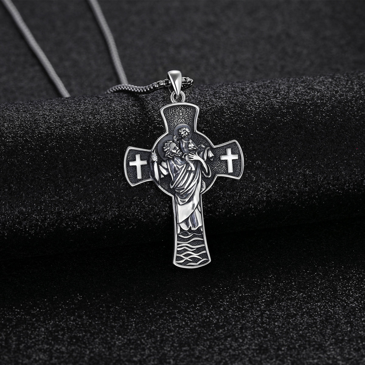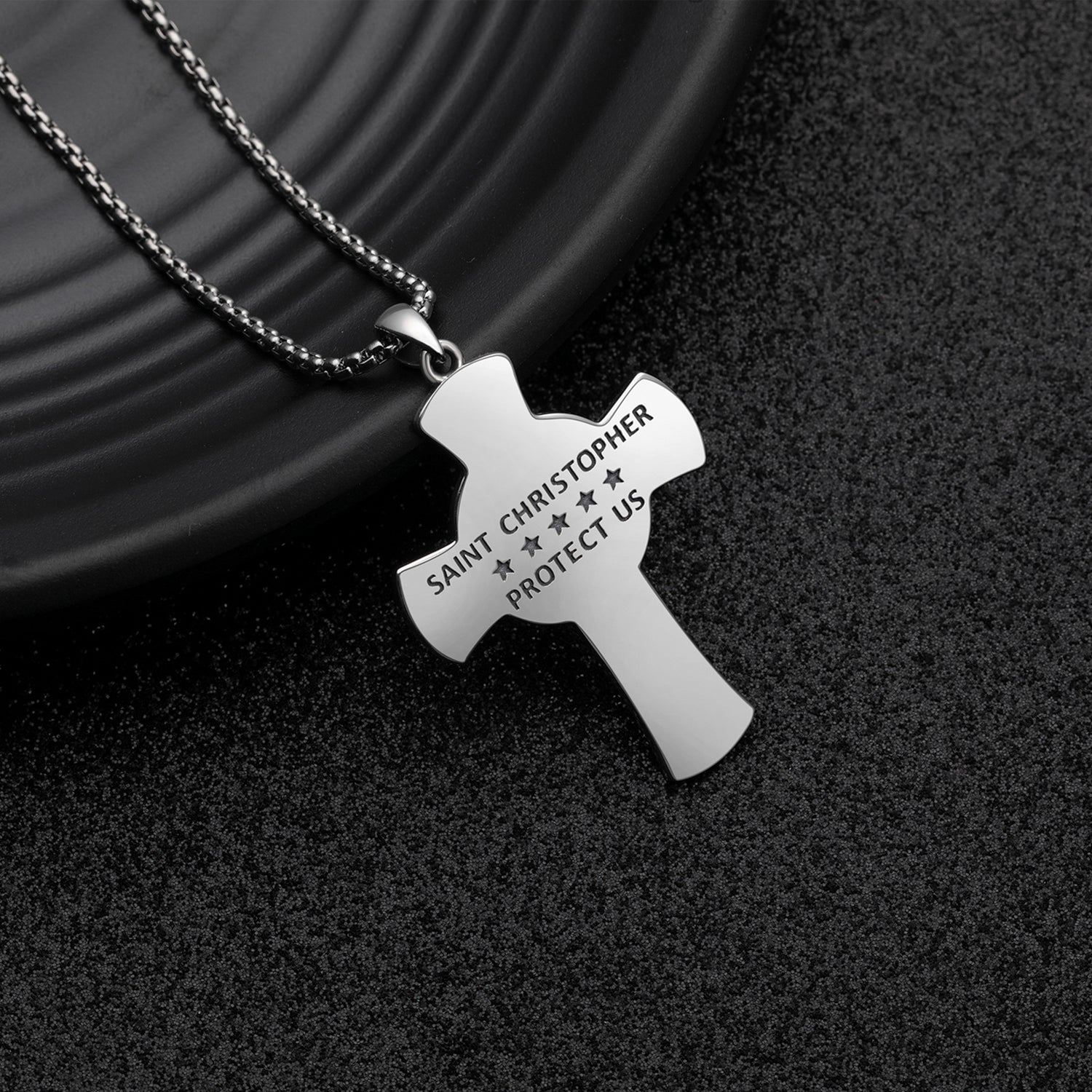 Sterling Silver Cross & Saint Christopher Pendant Necklace with Engraved Word