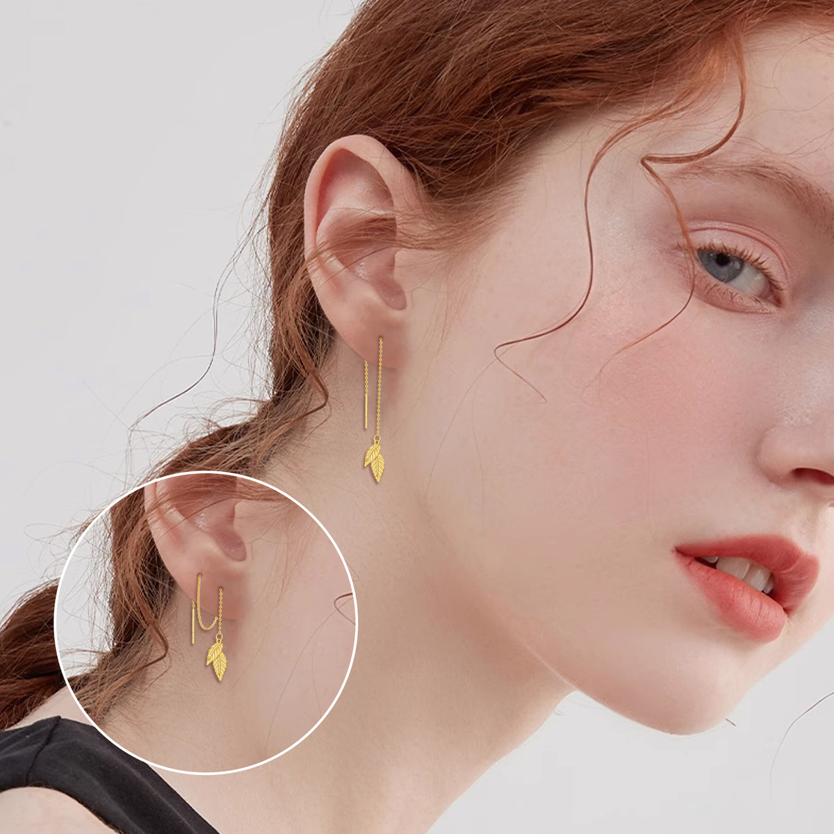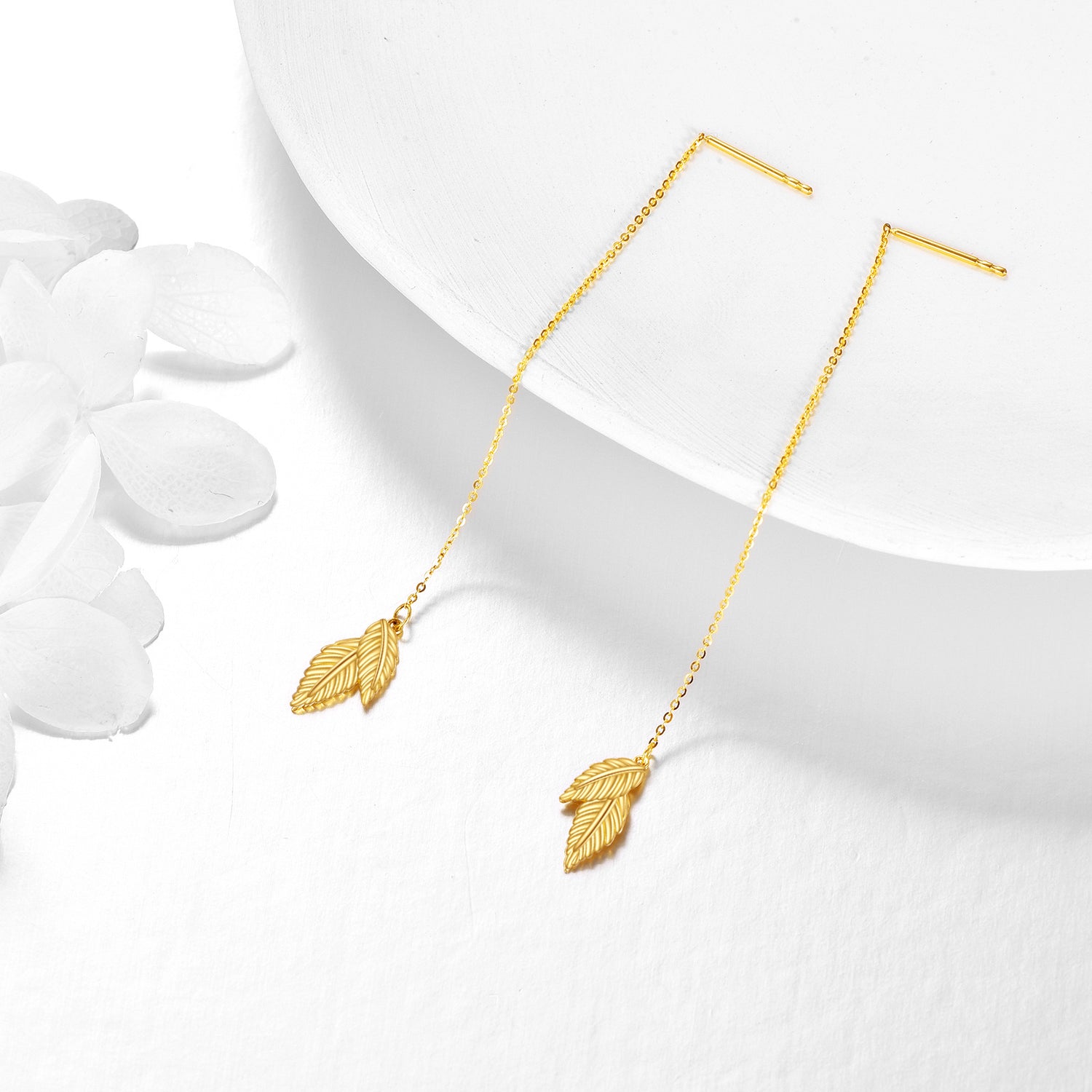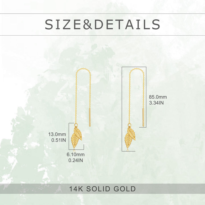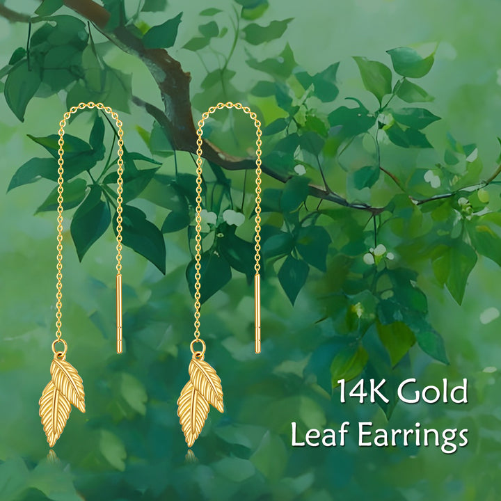 14K Yellow Gold Threader Pull Through Leaves Drop Earrings