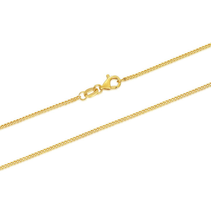 14K solid yellow gold curb chain, 1.35 mm width. Available in lengths of 14, 24, and 28 inches. Secured with a lobster clasp.