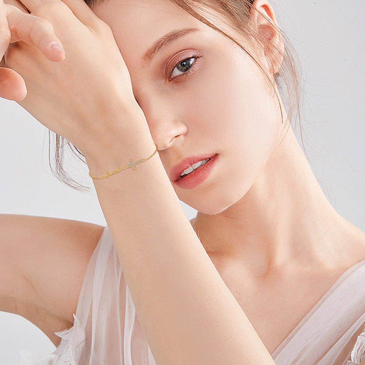 This Personalized Name Cross Bracelet by YFN is a stunning 14K Gold Charm Bracelet designed for women who cherish personalized elegance and faith. Adorned with sparkling cubic zirconia for a touch of brilliance, this versatile bracelet features a beautifully crafted name Charm alongside a delicate cross, symbolizing faith and protection. This piece effortlessly merges sophistication and personalization, making it a cherished keepsake perfect for everyday wear or elegant events.