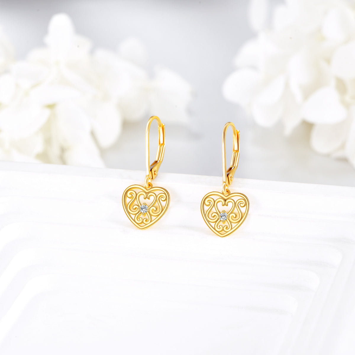 14K Gold Personalized Birthstone Flowers Heart Lever-back Earrings for Women