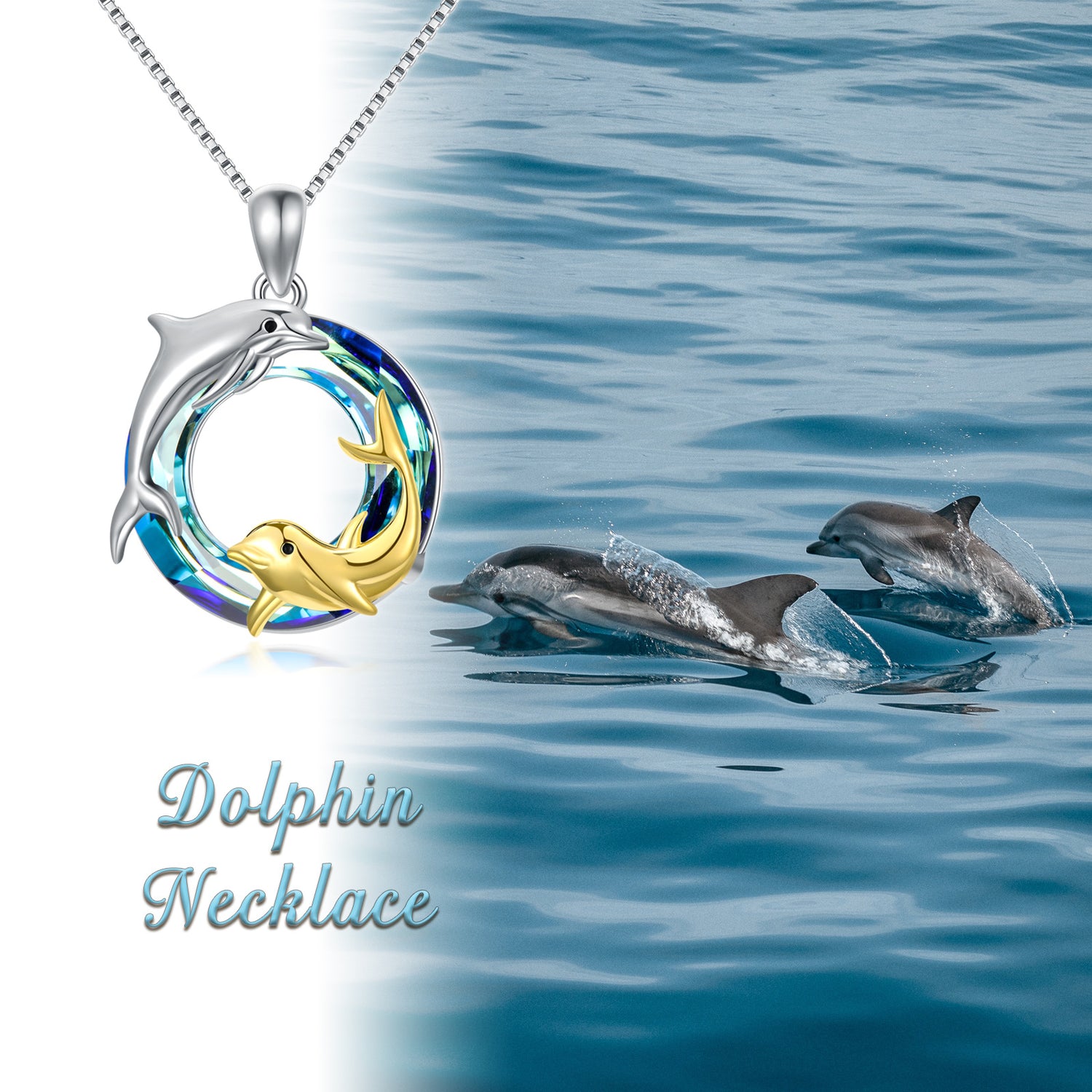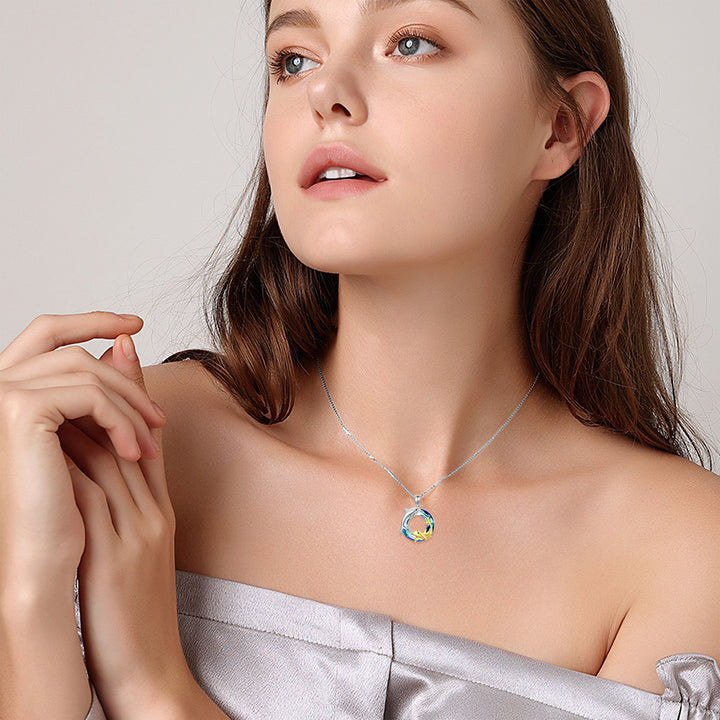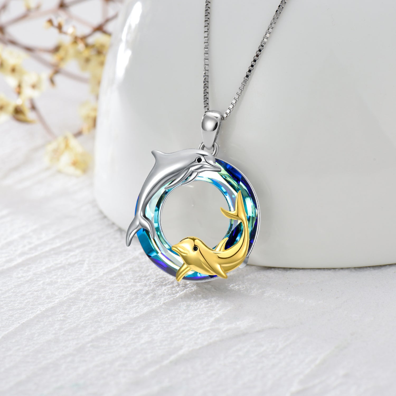 This Sterling Silver Two-Tone Circular Crystal Dolphin Pendant Necklace by YFN symbolizes the mother-daughter bond for women. This dazzling Circular Shaped Crystal Pendant Necklace features a beautiful Dolphin Motif and is available in both White Gold and Yellow Gold options over sterling silver, combining brilliance with enduring quality.