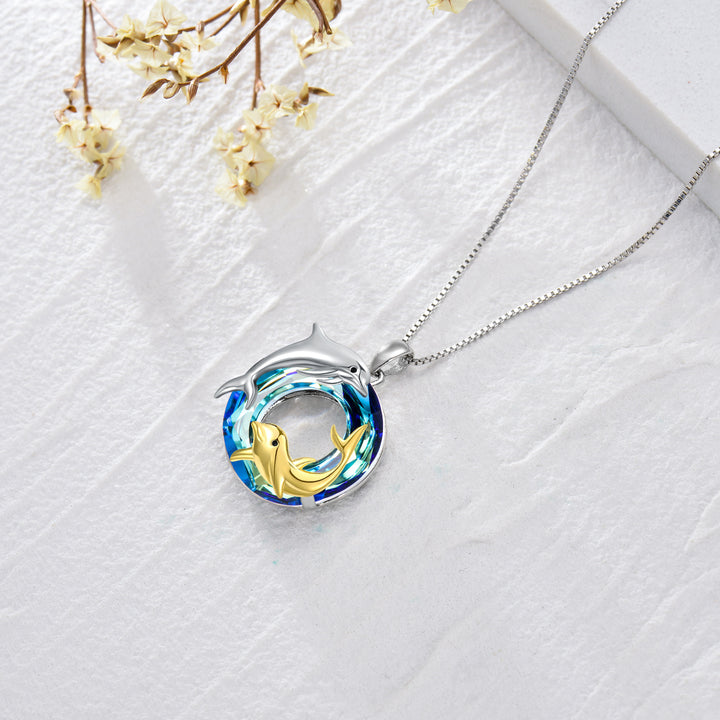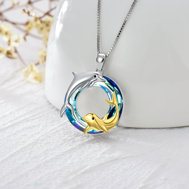 Sterling Silver Two-Tone Circular Crystal Dolphin Pendant Necklace For Mother