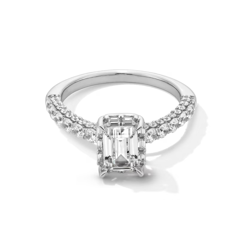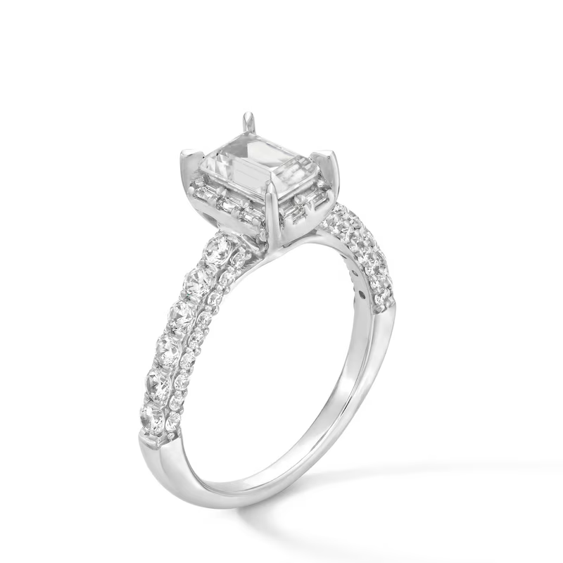 Crafted from Solid 14K White Gold featuring an Emerald-Cut Lab-Created Diamond (0.5–3 CT) with a total weight of 1.5–4 CT, set in a Halo with Emerald Baguette accents (D color, VVS1–VS1 clarity, IGI Certified).