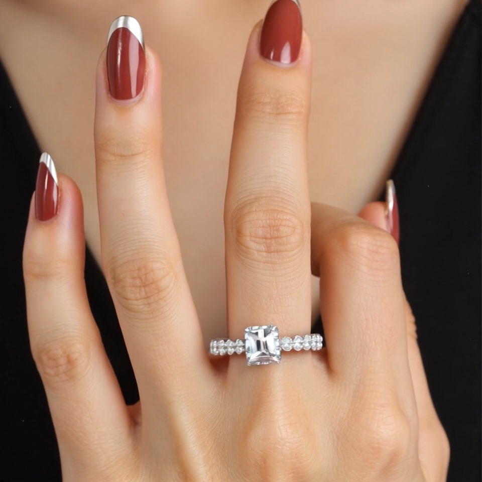 This 14K White Gold Emerald-Cut Diamond Engagement Ring by YFN is a breathtaking IGI-certified masterpiece. Featuring an emerald-cut lab-created diamond of exceptional clarity and D color, framed by emerald baguette accents and a radiant halo, it offers extraordinary brilliance. A luxurious choice for women seeking a refined, unforgettable engagement ring.