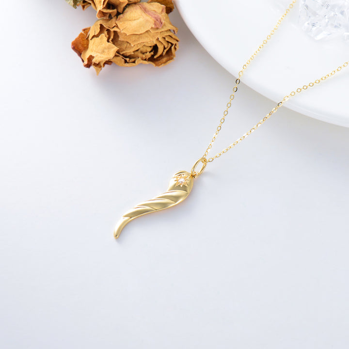 14K Gold Oval Shaped Cubic Zirconia Feather Pendant Necklace