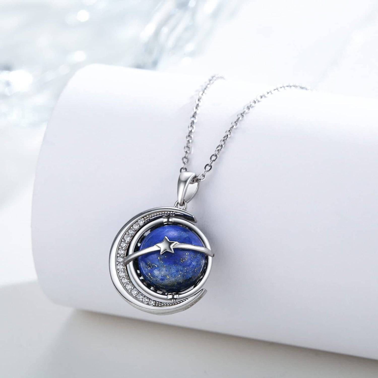 Sterling silver; white gold plating; moon and planet pendant; no stones; includes chain.