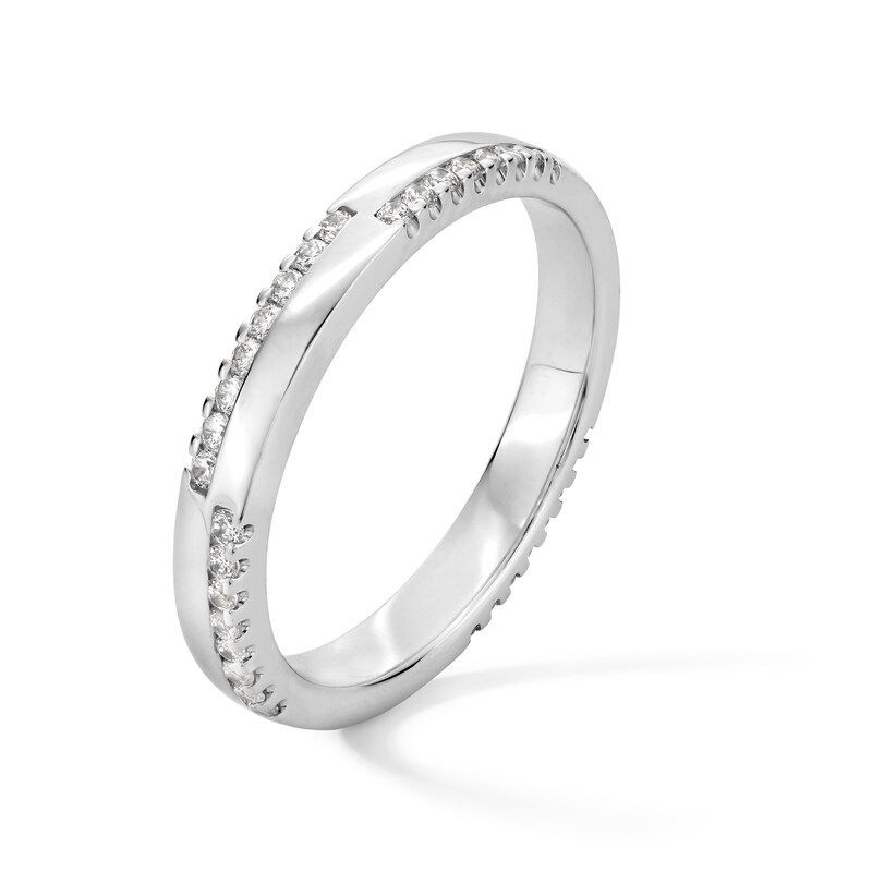 Solid 14K white gold anniversary band. Features round diamonds (I color, I2 clarity, 0.25 CT total weight). Designed in an alternating double-row, stackable style. Features Excellent (3EX) cut, polish, and symmetry.