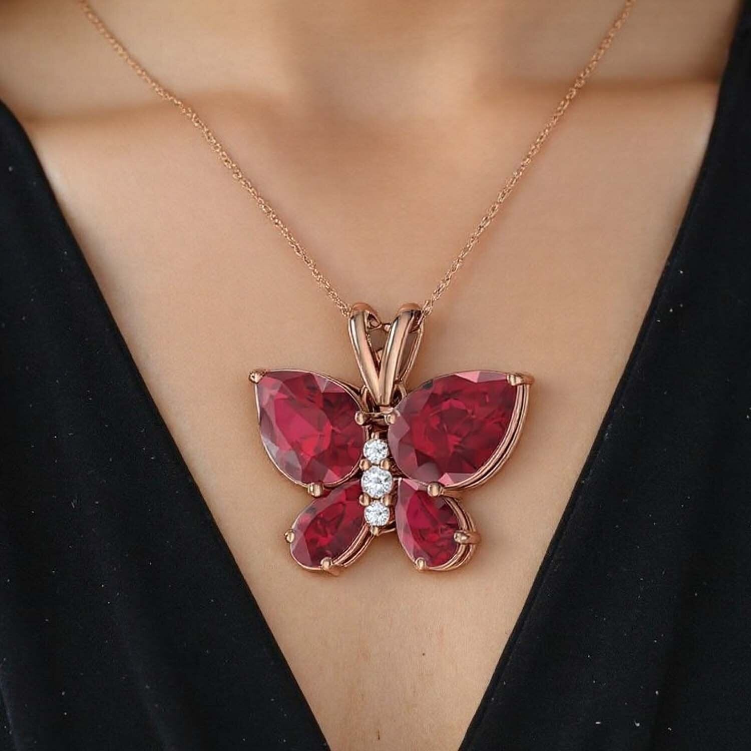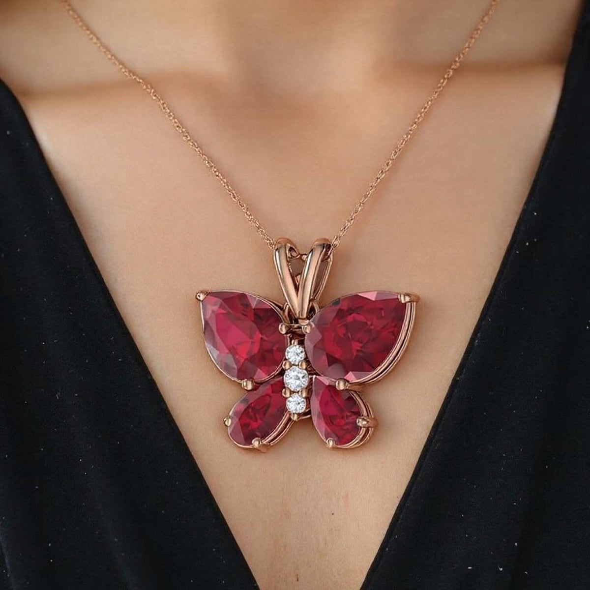 This pendant necklace is crafted from 14K solid rose gold. It features a butterfly motif set with Moissanite and a ruby centerpiece, and is designed for mothers and sisters.