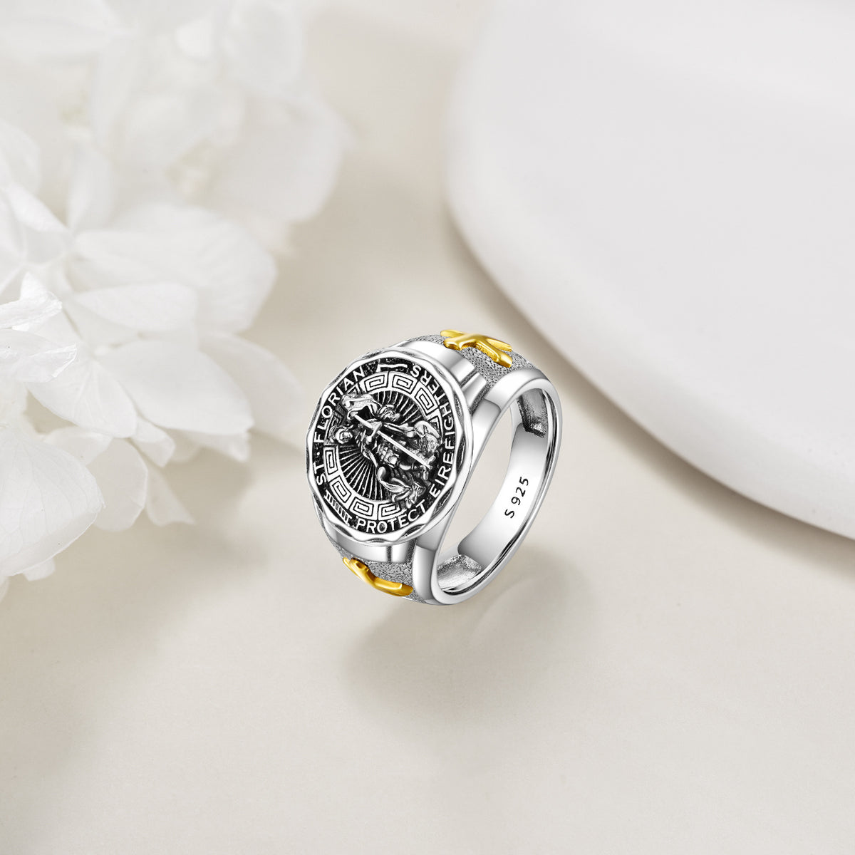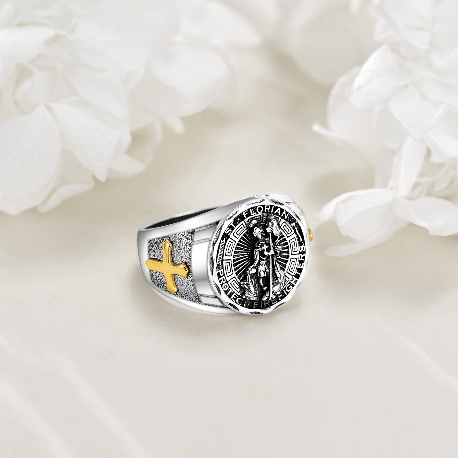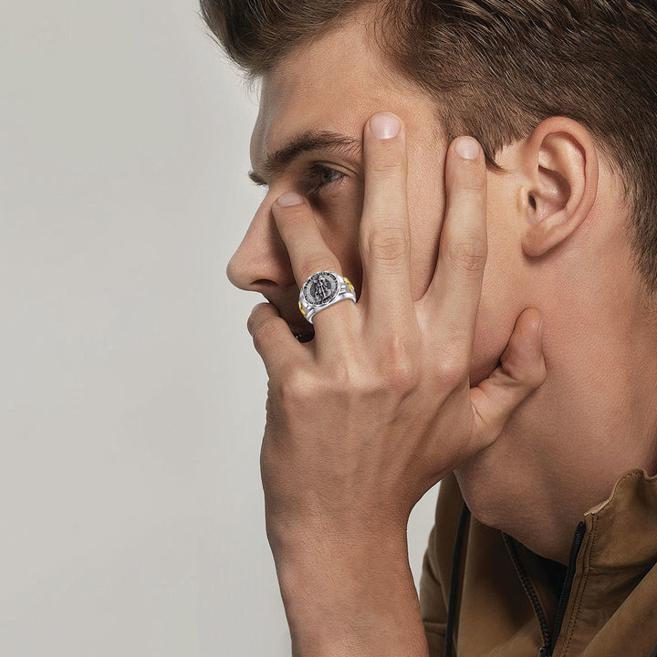 Sterling Silver Two-tone Cross & Saint Florian Signet Ring for Women Men