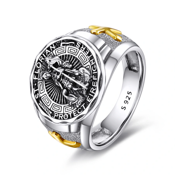 This Sterling Silver Two-tone Cross & Saint Florian Signet Ring for Women Men by YFN is a no-stone, unisex signet ring, celebrating courage and protection. Crafted from high-quality sterling silver with a silver oxide finish and gold accents (Two-Tone), the ring features a striking cross and the Saint Florian emblem, making a powerful statement of faith and heroism.