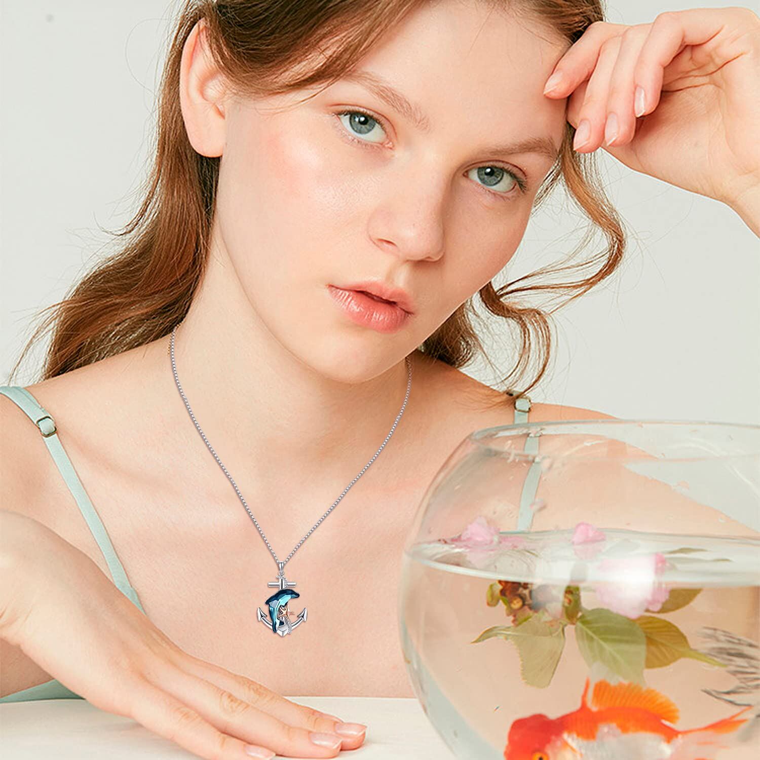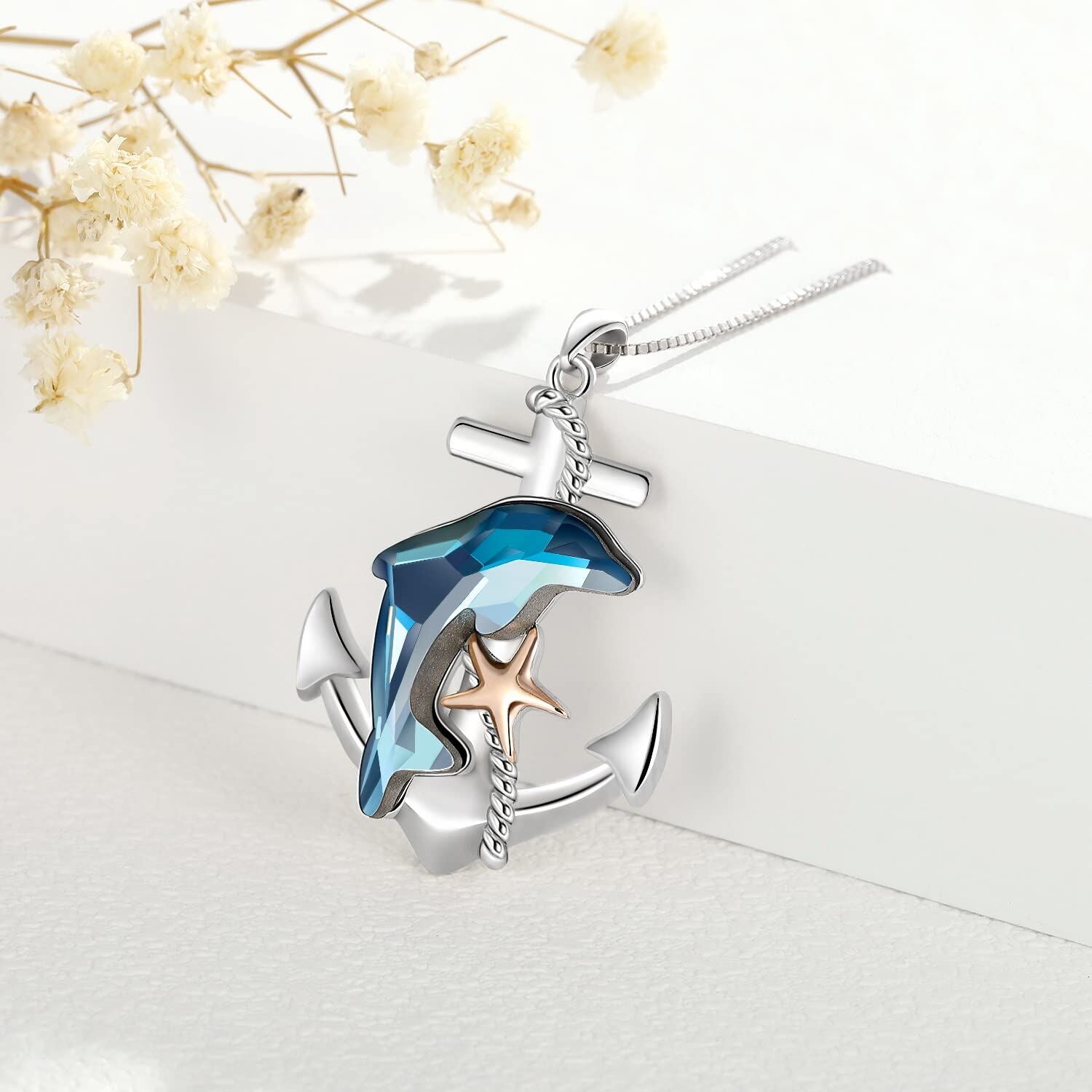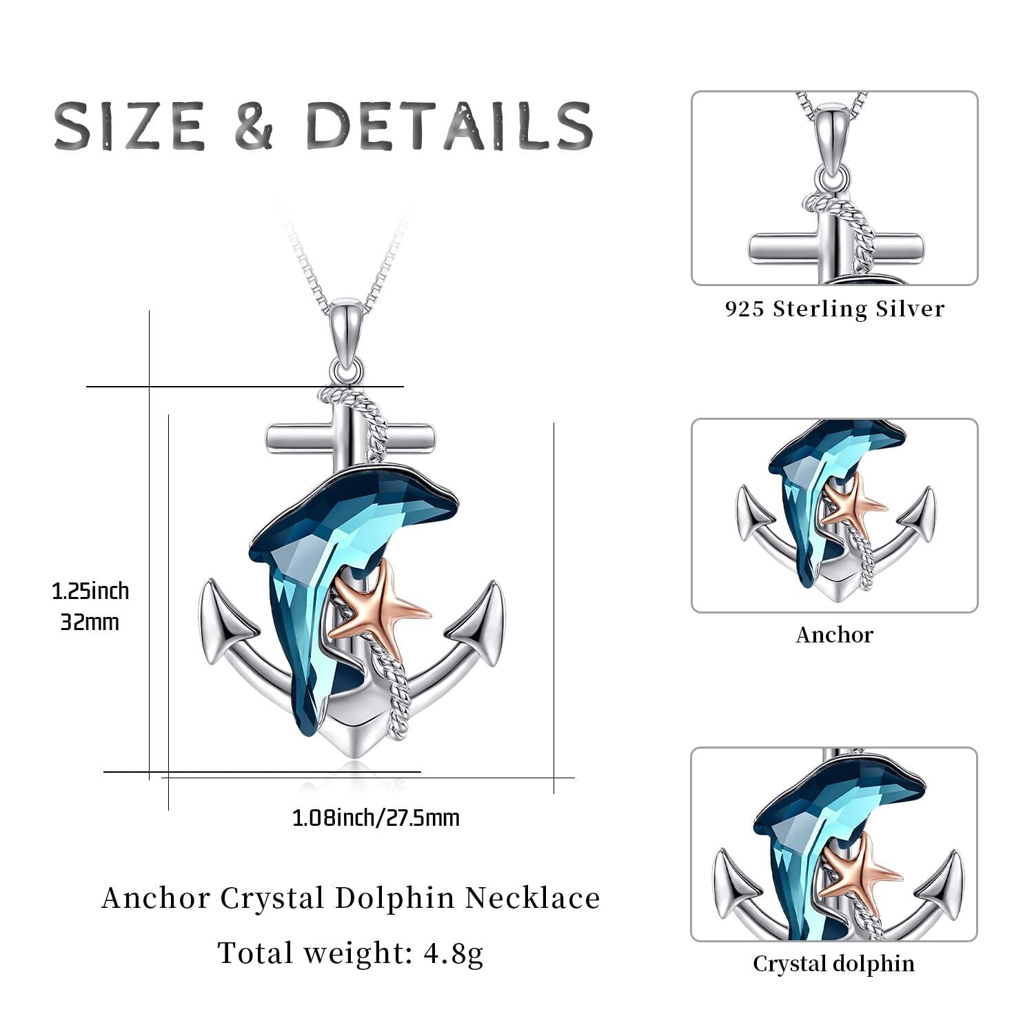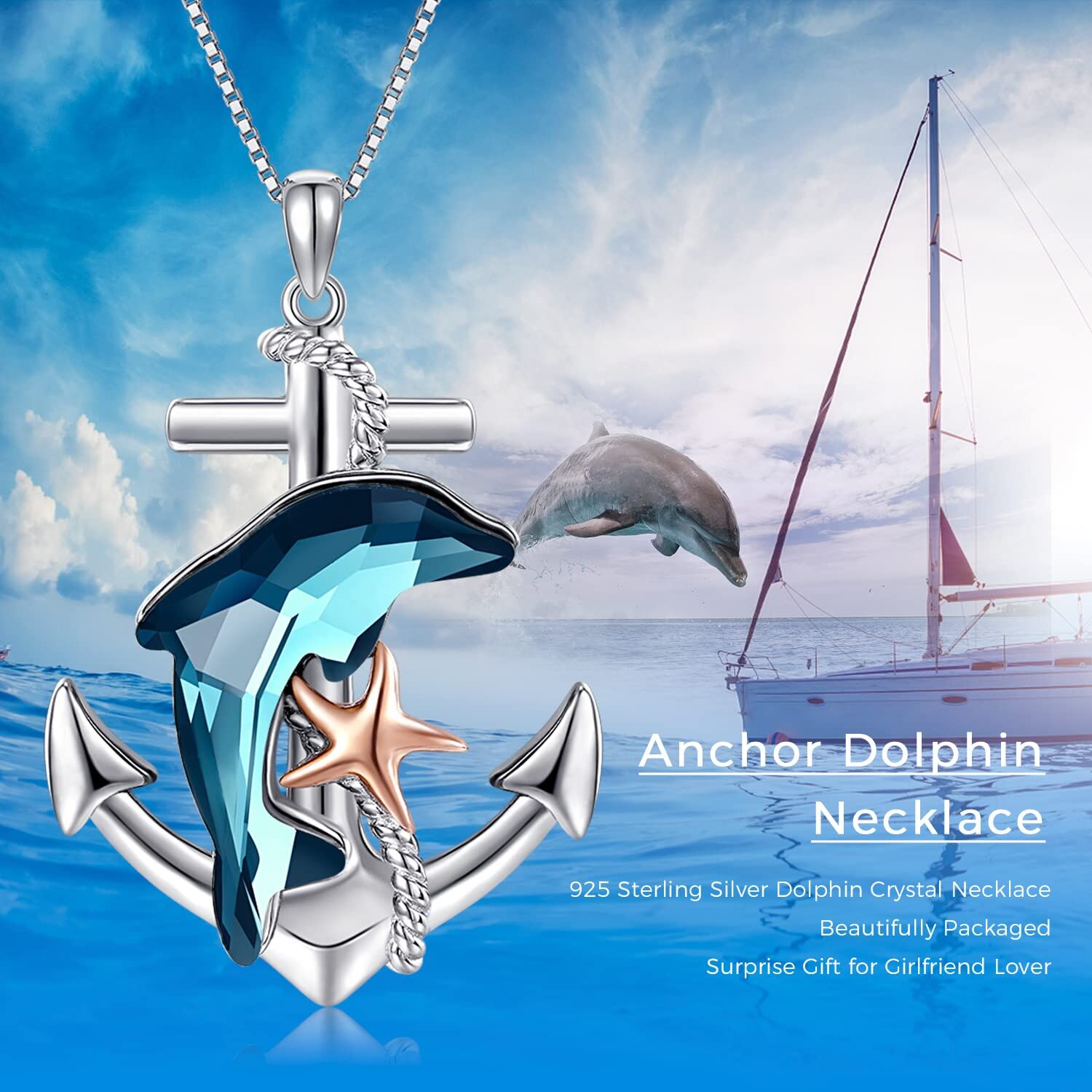Crafted from high-quality Sterling Silver, this Pendant Necklace features charming Dolphin and Anchor shapes intricately crafted with shimmering Blue Crystals, available in Silver and Rose Gold finishes.