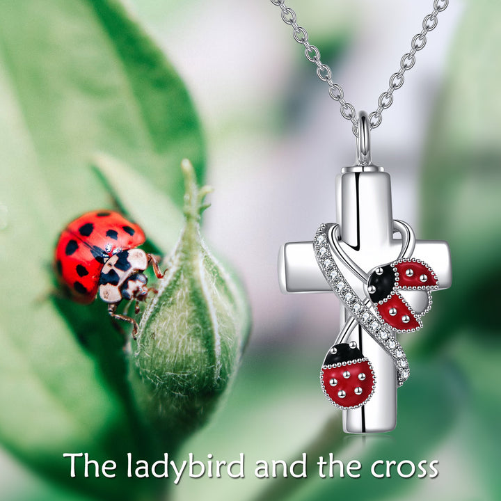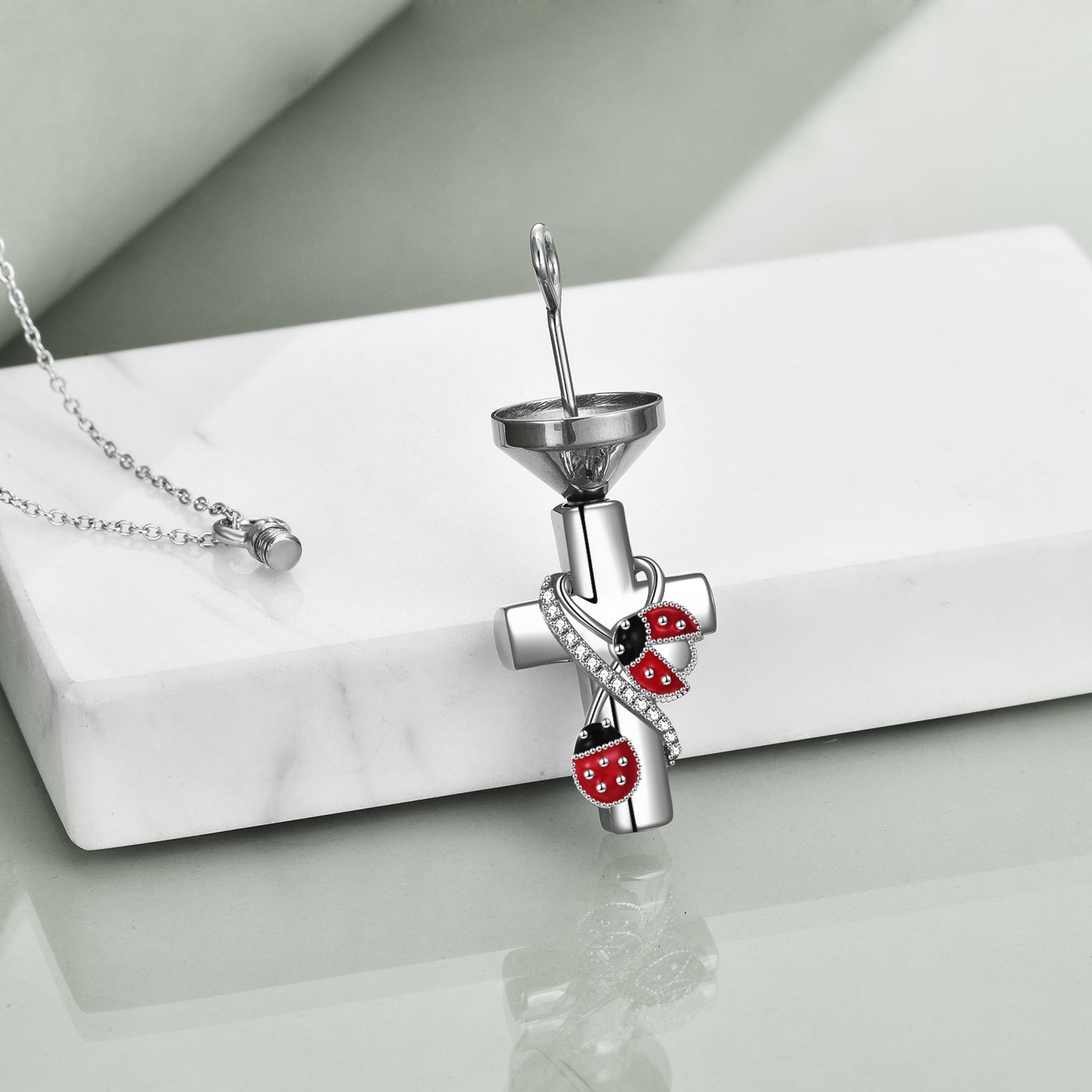 Sterling Silver Cubic Zirconia Ladybug & Cross Urn Necklace for Ashes with Engraved Word
