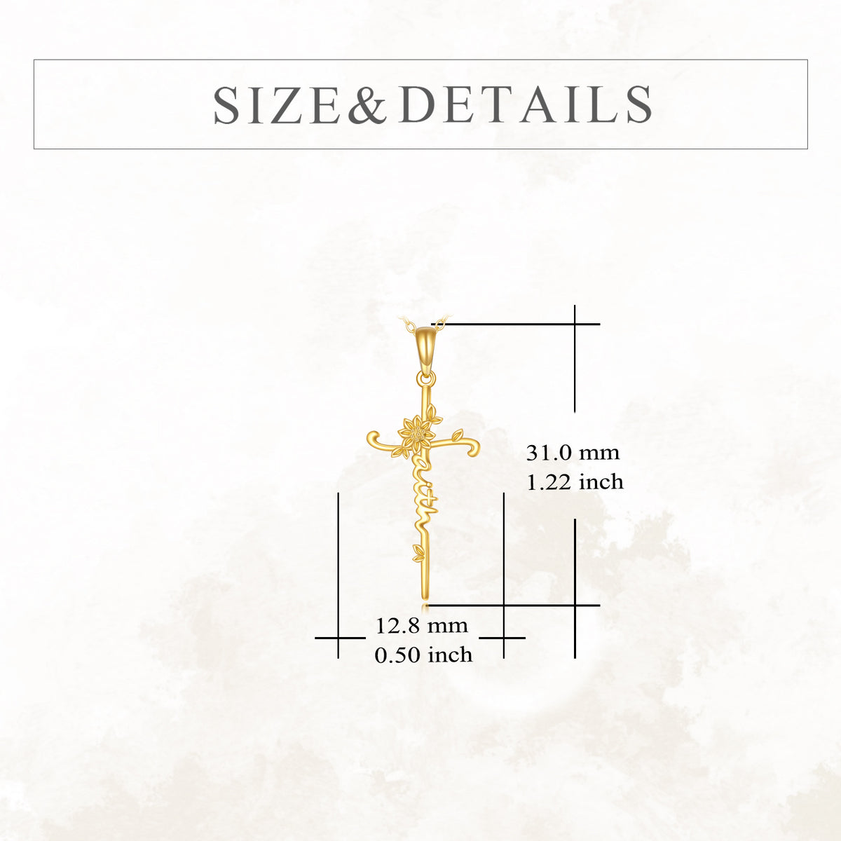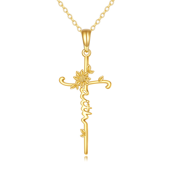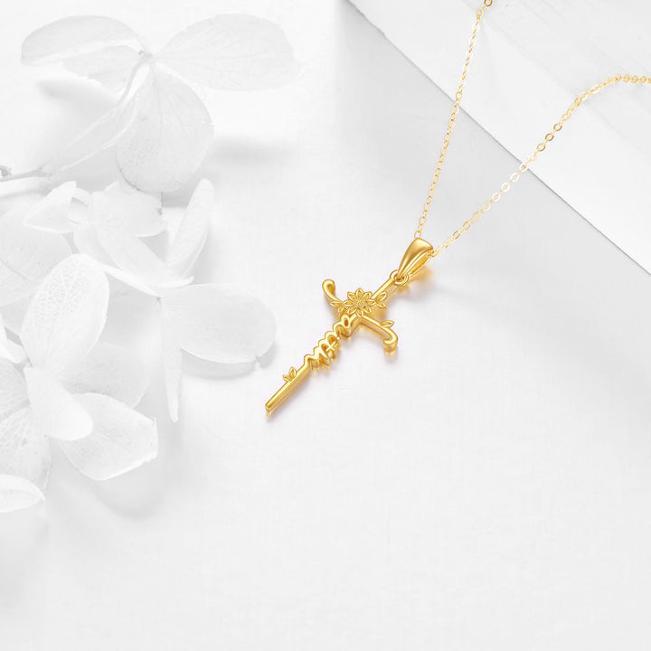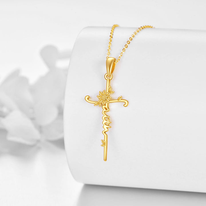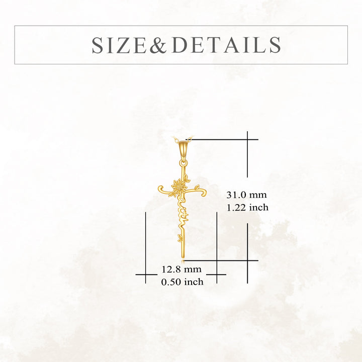 14K Gold Sunflower & Cross Pendant Necklace with Engraved Word
