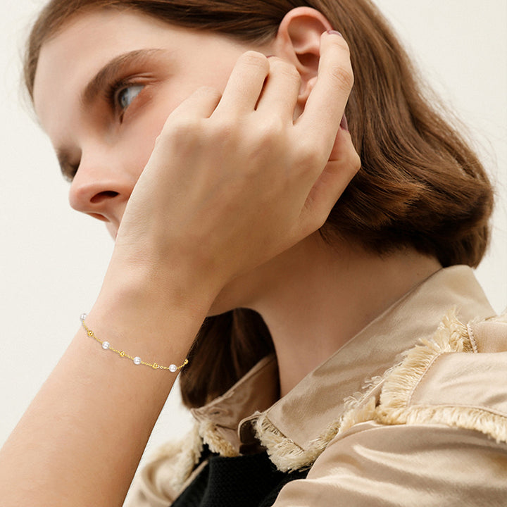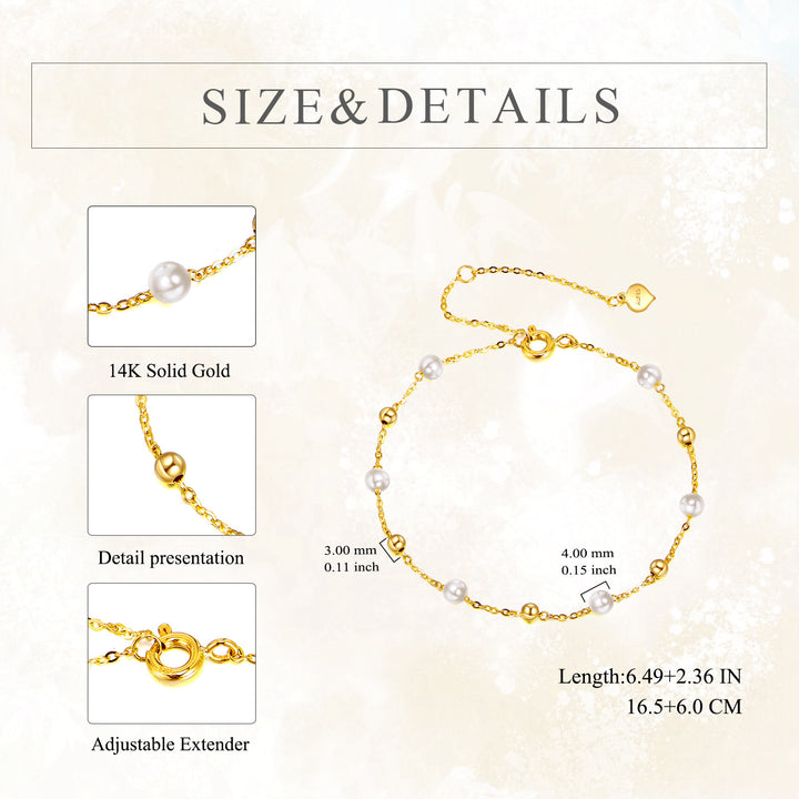 14K Gold Pearl Bead Bead Station Chain Bracelet For Women