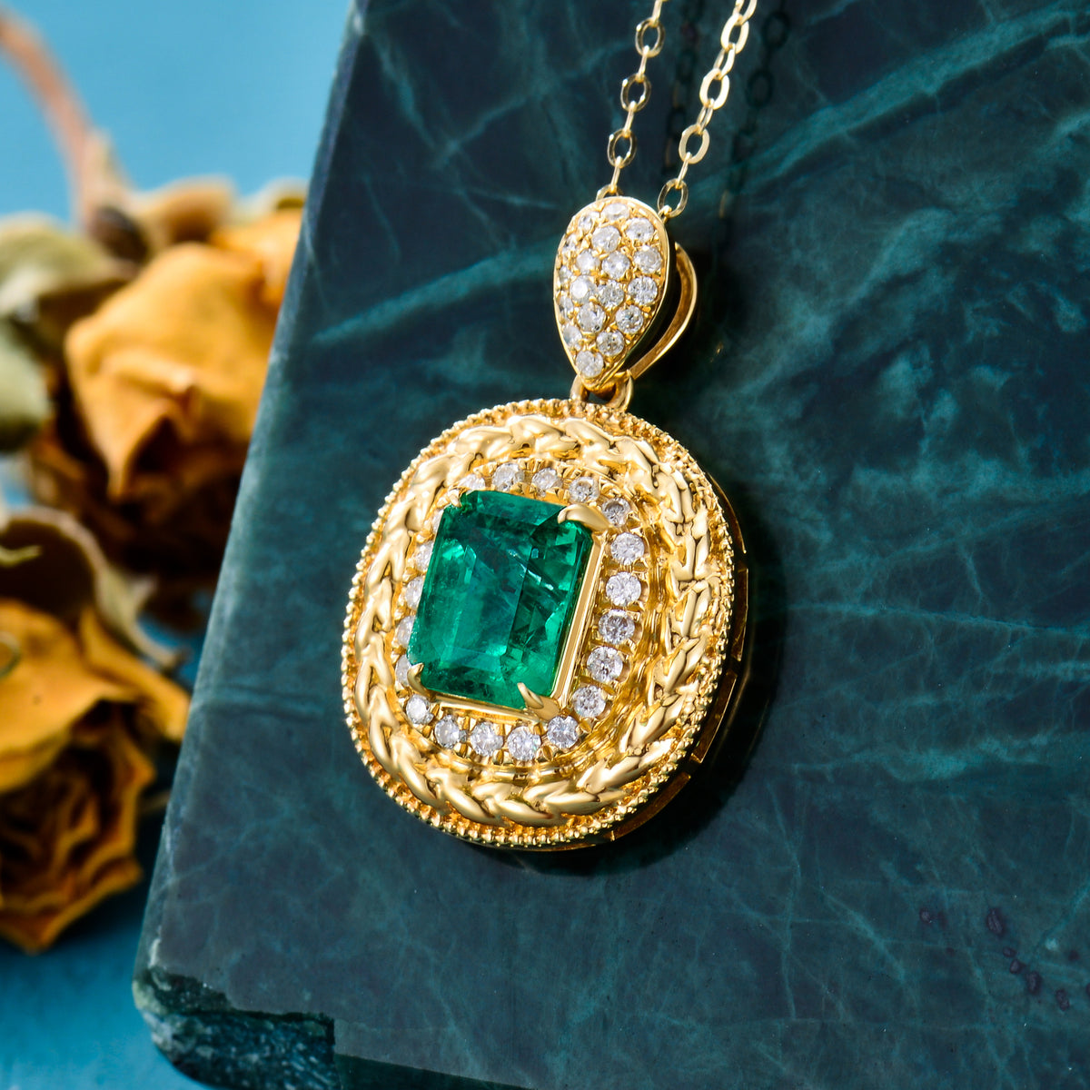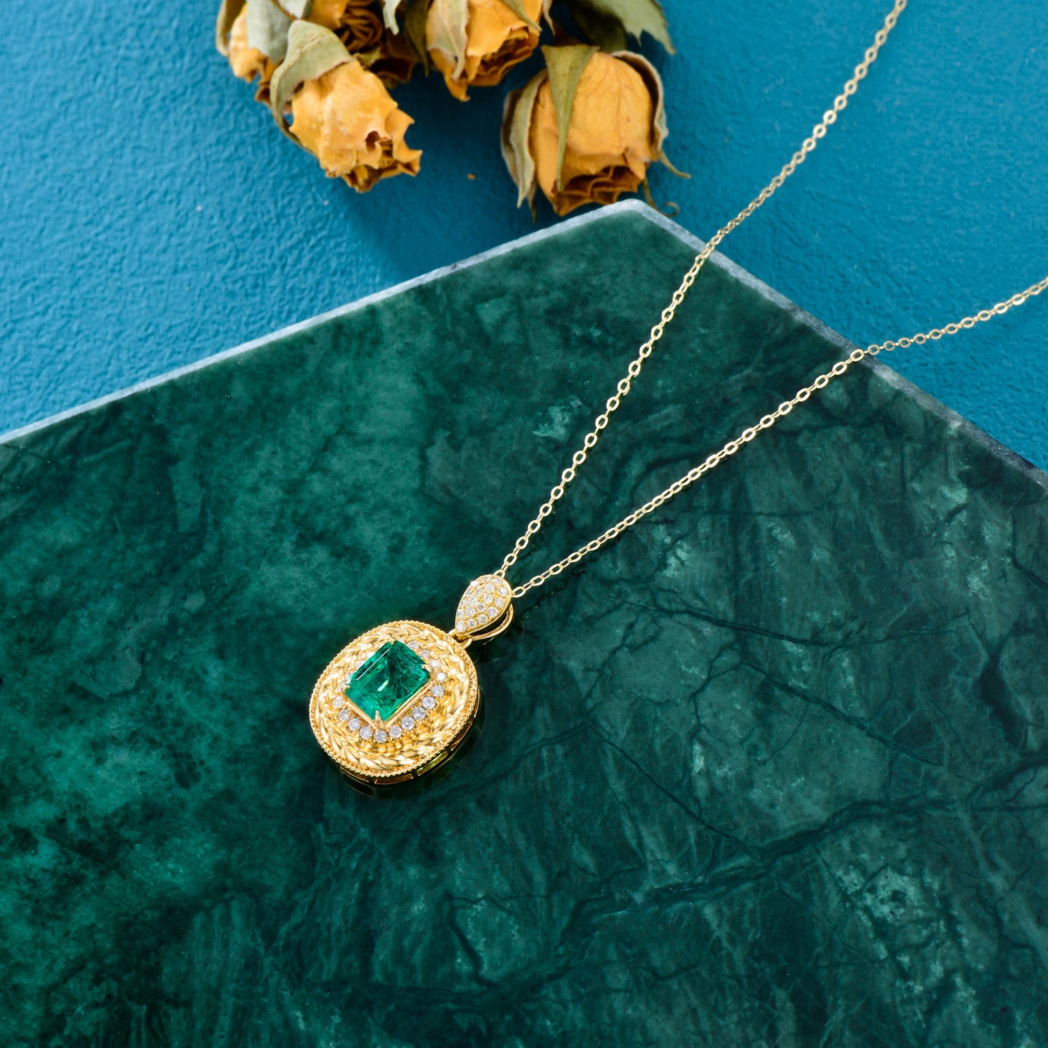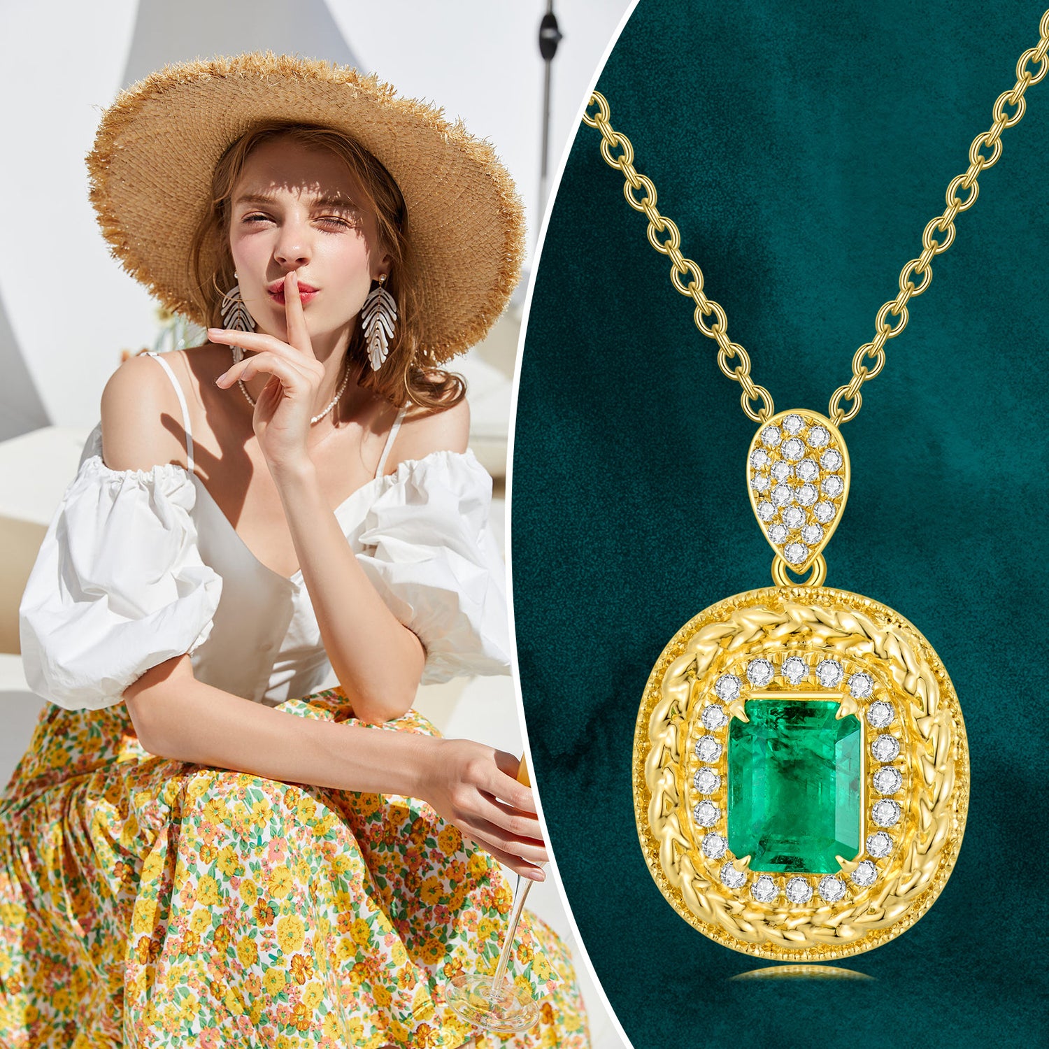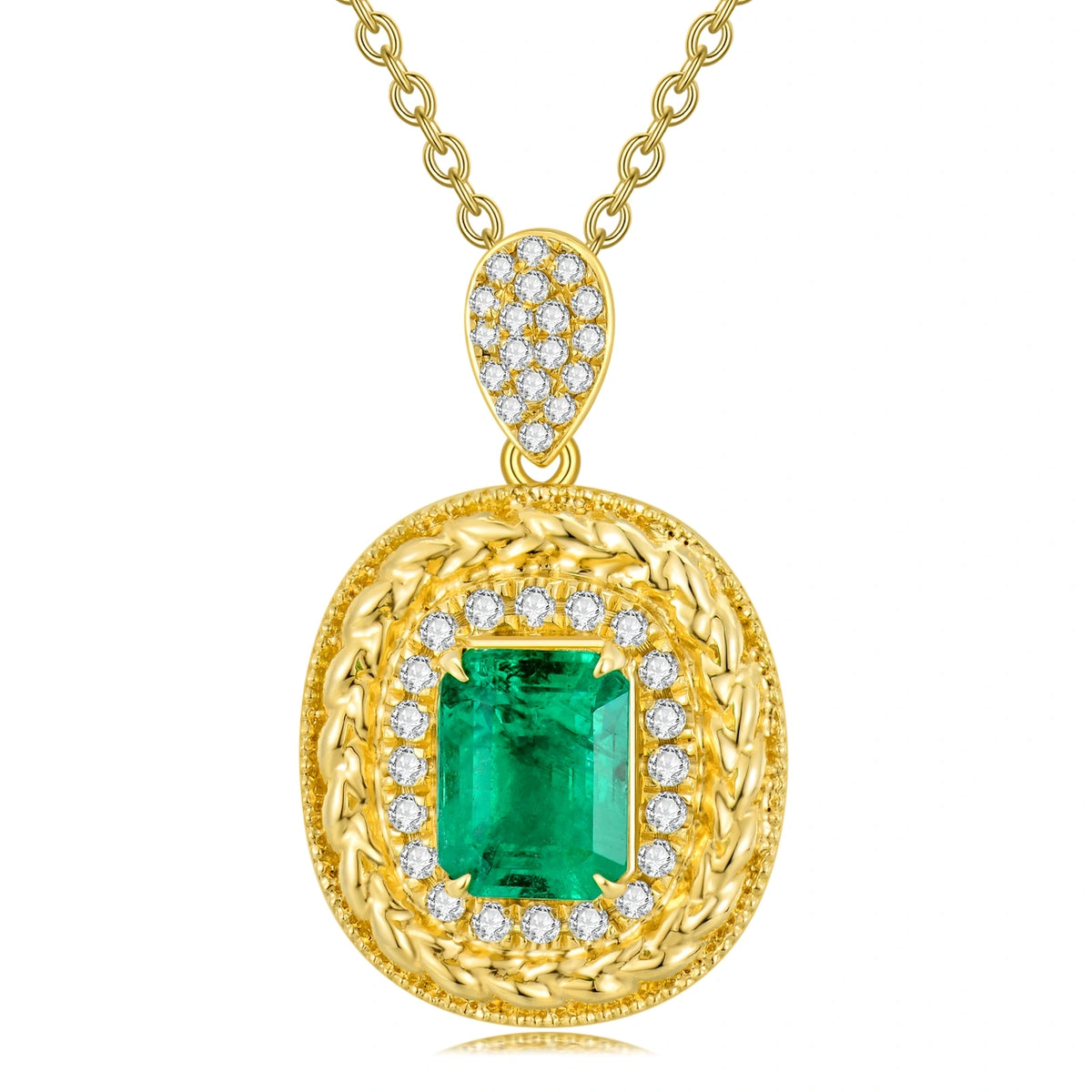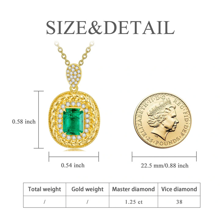 Crafted from Sterling Silver with Yellow Gold Plating, this Pendant Necklace features a Round Emerald Centerpiece (1.25 CT T.W.) flanked by shimmering Round Cubic Zirconia.