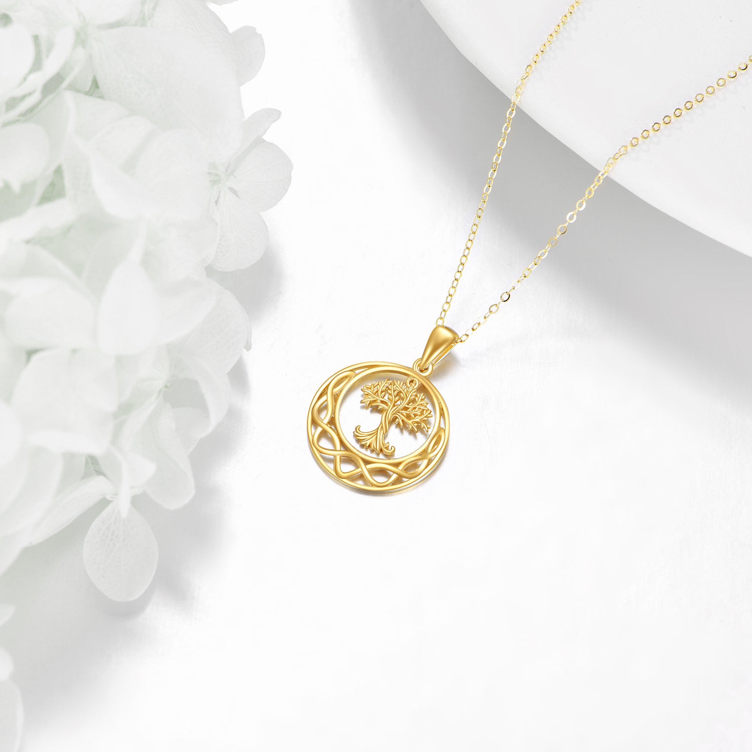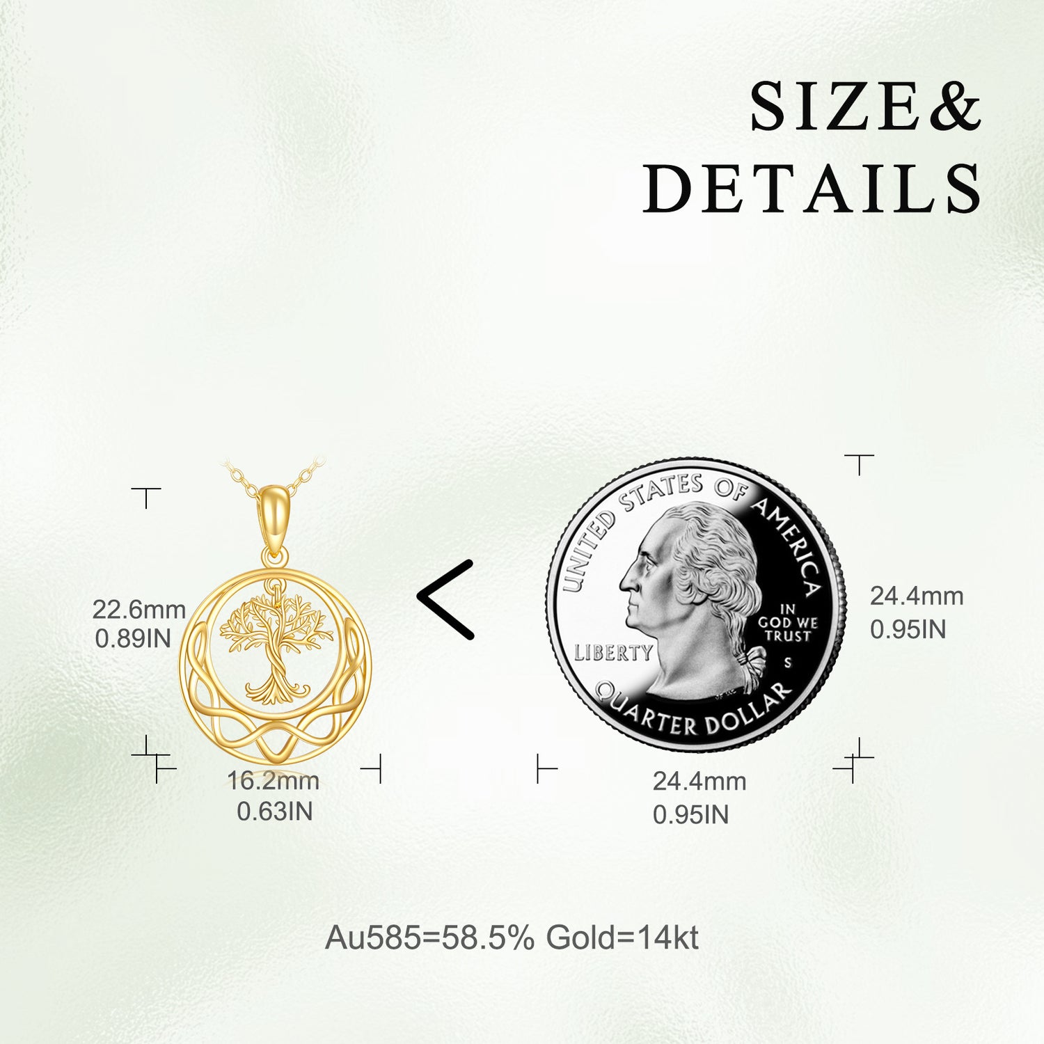 Crafted from 14K solid gold. Designed as a pendant necklace. Features Tree of Life and Celtic Knot motifs. Stone-free design.