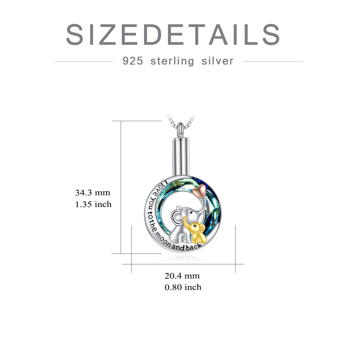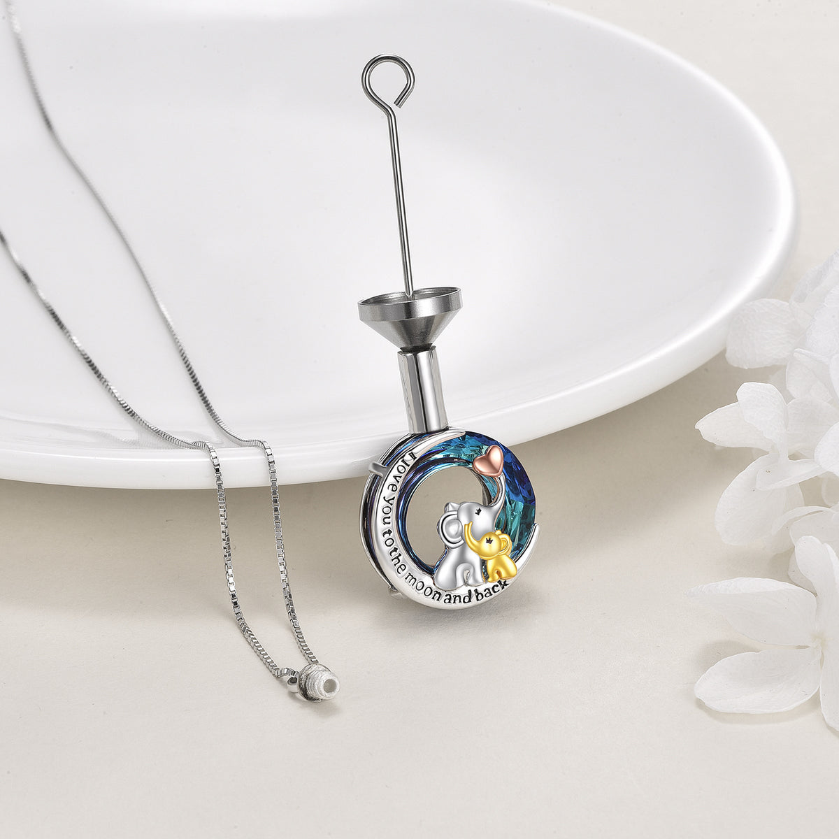 This urn necklace is crafted from Sterling Silver with a tri-tone finish (Silver, Gold, Rose Gold). It features a blue round crystal and intricate elephant and moon motifs, with the engraved message "I Love You To The Moon And Back."