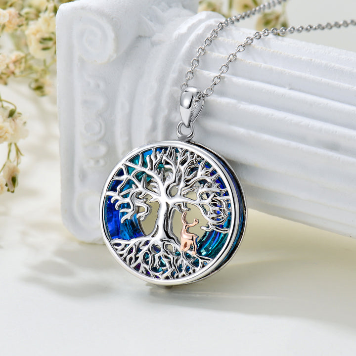 Crafted from high-quality Sterling Silver with Rose Gold accents, this circular Pendant Necklace features a mesmerizing Blue Crystal and an intricately detailed Elk and Tree of Life motif.