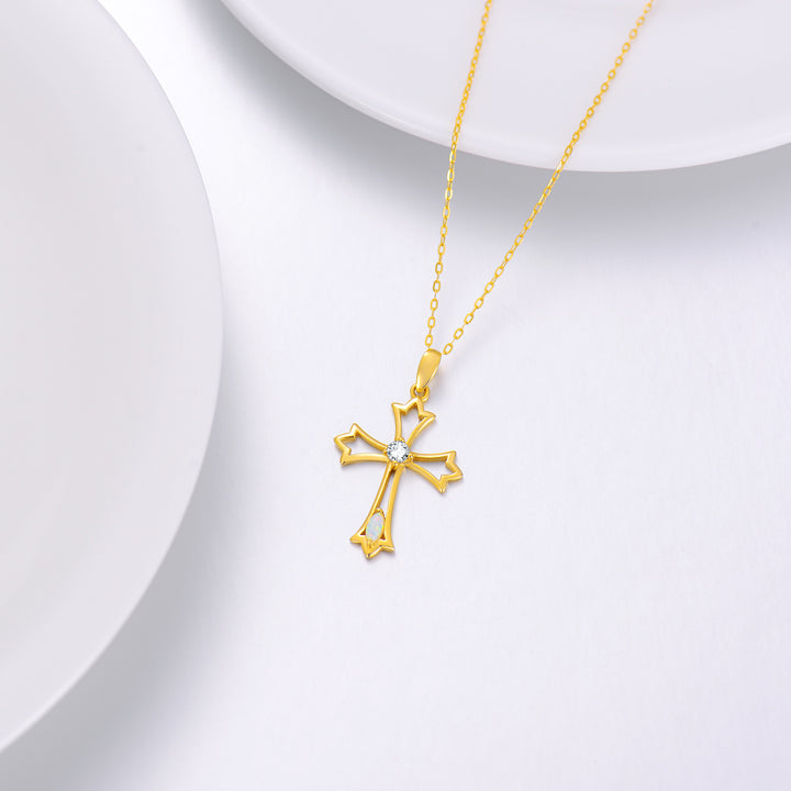 Crafted from 14K Gold, this Cross Pendant Necklace is adorned with radiant Cubic Zirconia and a captivating Opal Centerpiece.