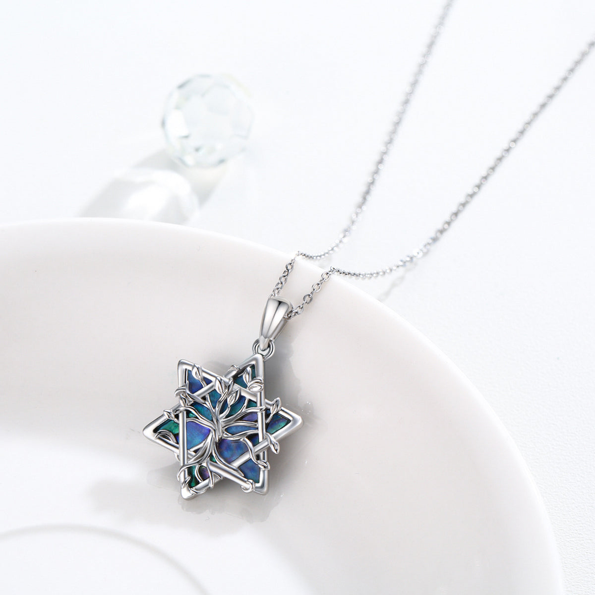 Crafted from Sterling Silver with White Gold Plating, this Pendant Necklace features Abalone Shellfish, and a dual motif of the Tree of Life and the Star of David.