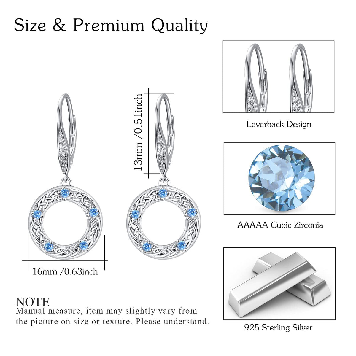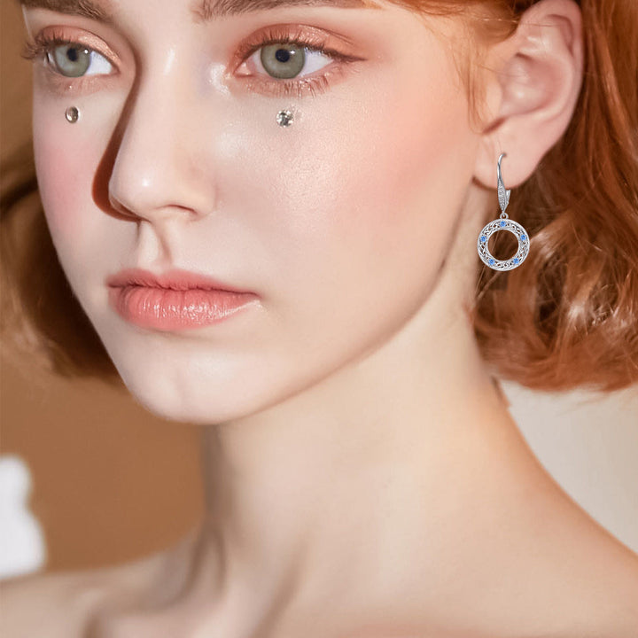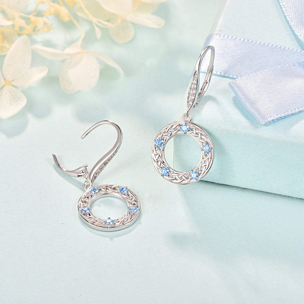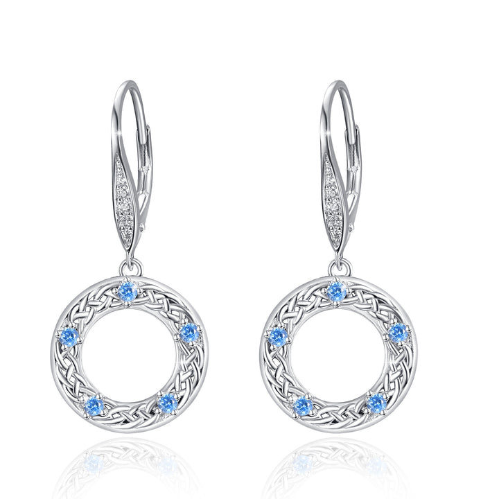 These Circular Shaped Lever-back Earrings are Crafted from Sterling Silver with White Gold Plating, adorned with Mesmerizing Blue Cubic Zirconia Stones and an Intricate Celtic Knot Design.