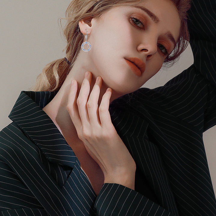 These Sterling Silver Circular Shaped Cubic Zirconia Celtic Knot & Circle Lever-back Earrings by YFN are exquisite lever-back earrings for women. Crafted from sterling silver and elegantly white gold plated, they feature a stunning circular shape adorned with mesmerizing Blue cubic zirconia stones and an intricate Celtic knot design.