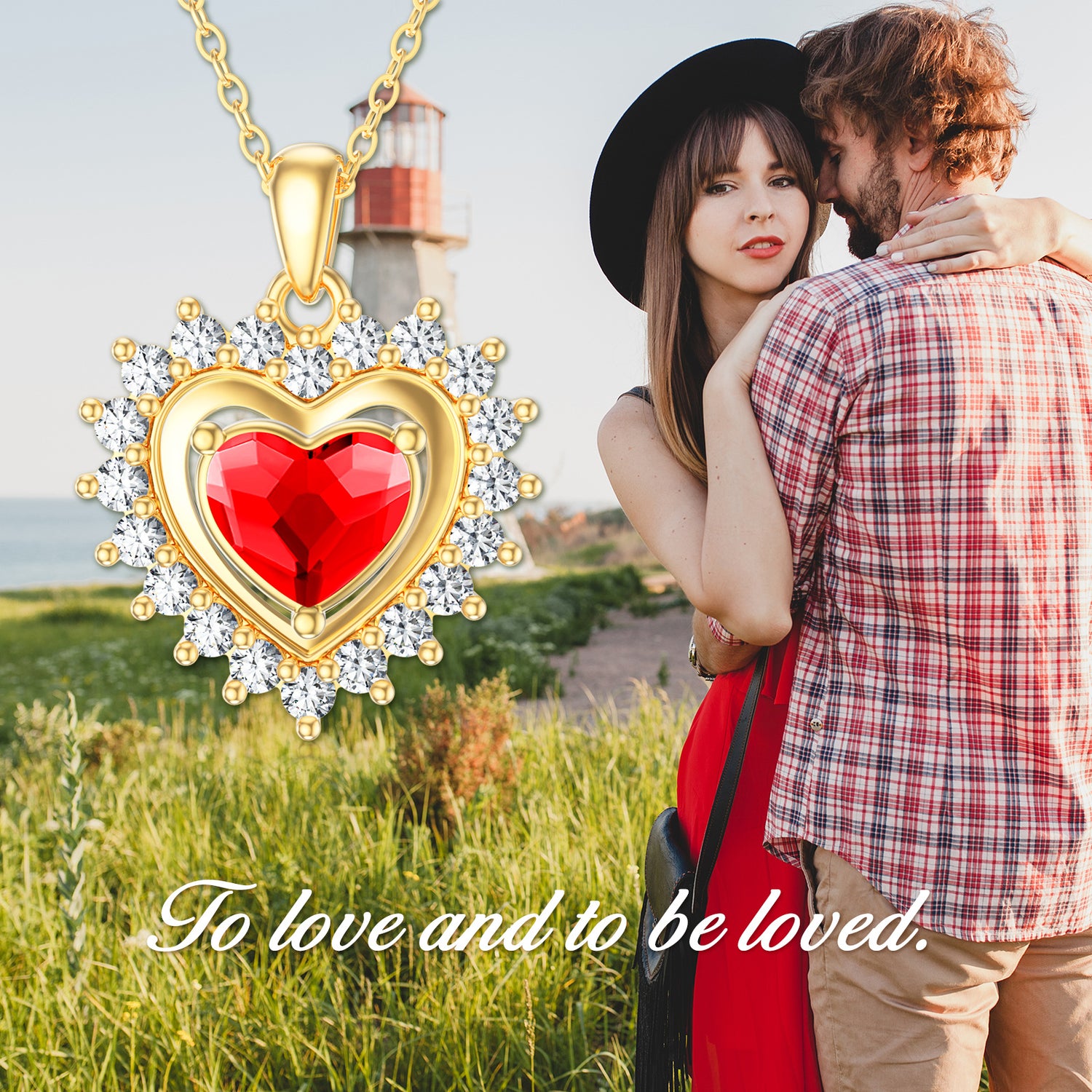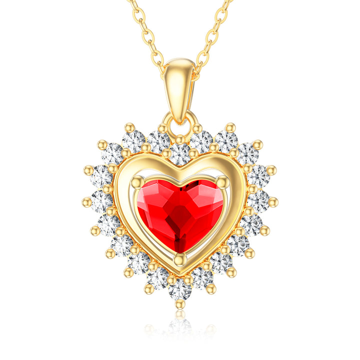 14K Solid Gold Red Crystal Halo Heart Pendant Necklace For Women