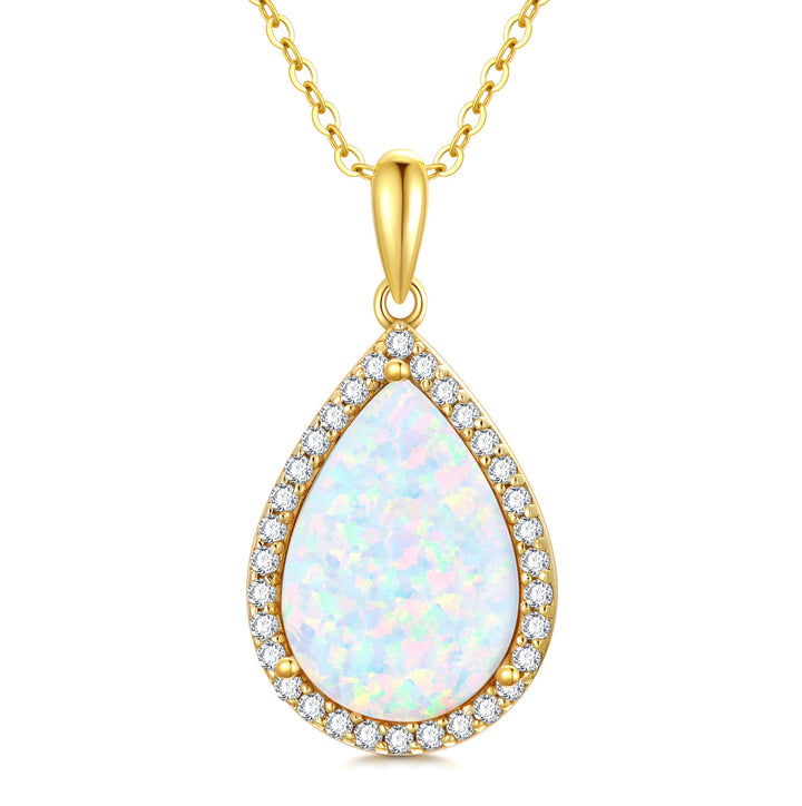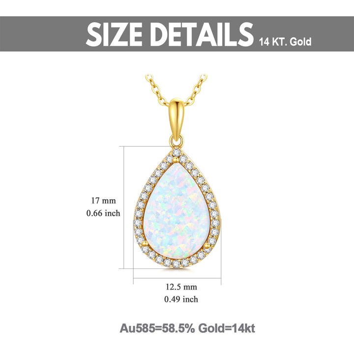 Crafted from 14K solid gold. Features a pear-cut cubic zirconia and a striking opal centerpiece. Designed in a drop shape pendant style. Suspended on a fine gold chain.