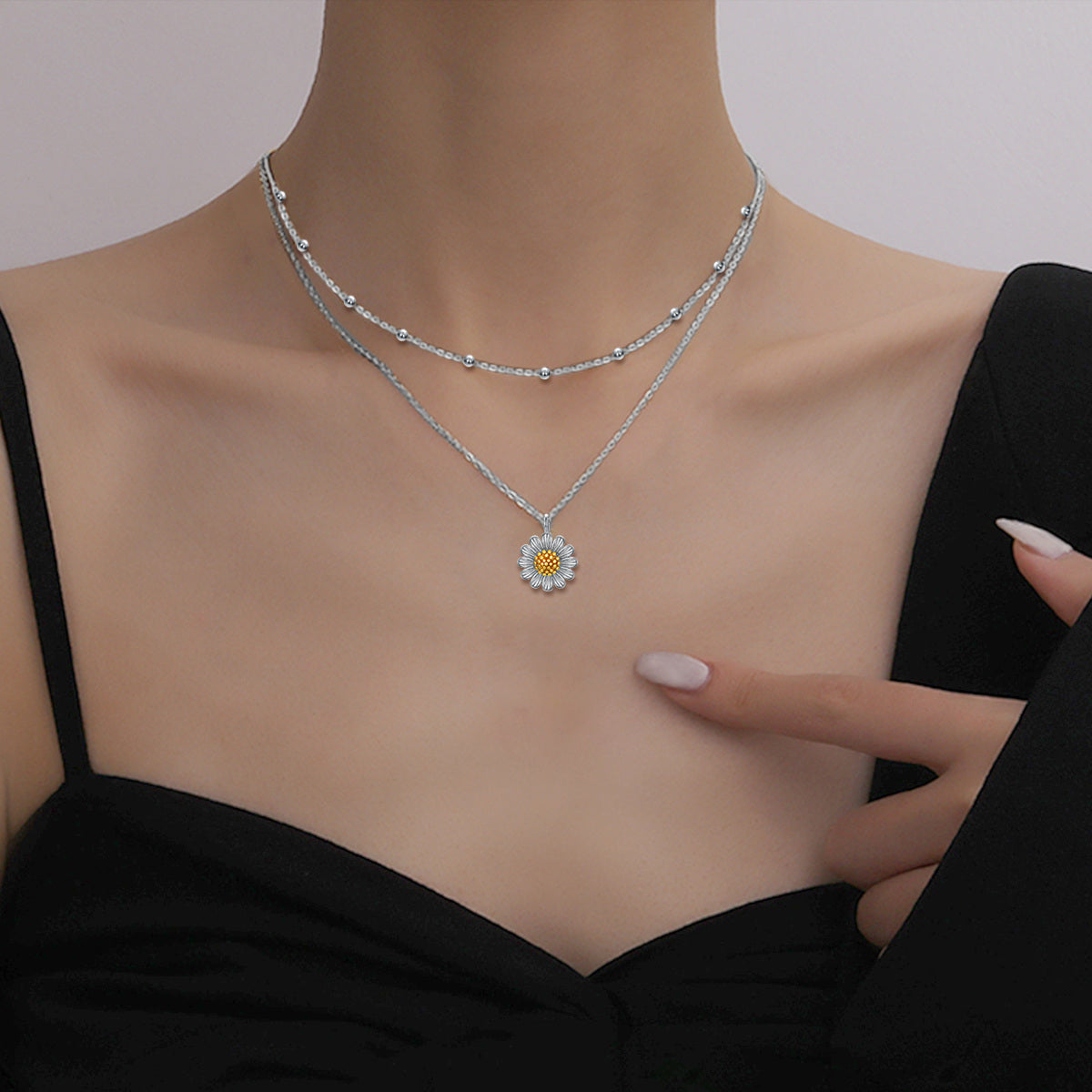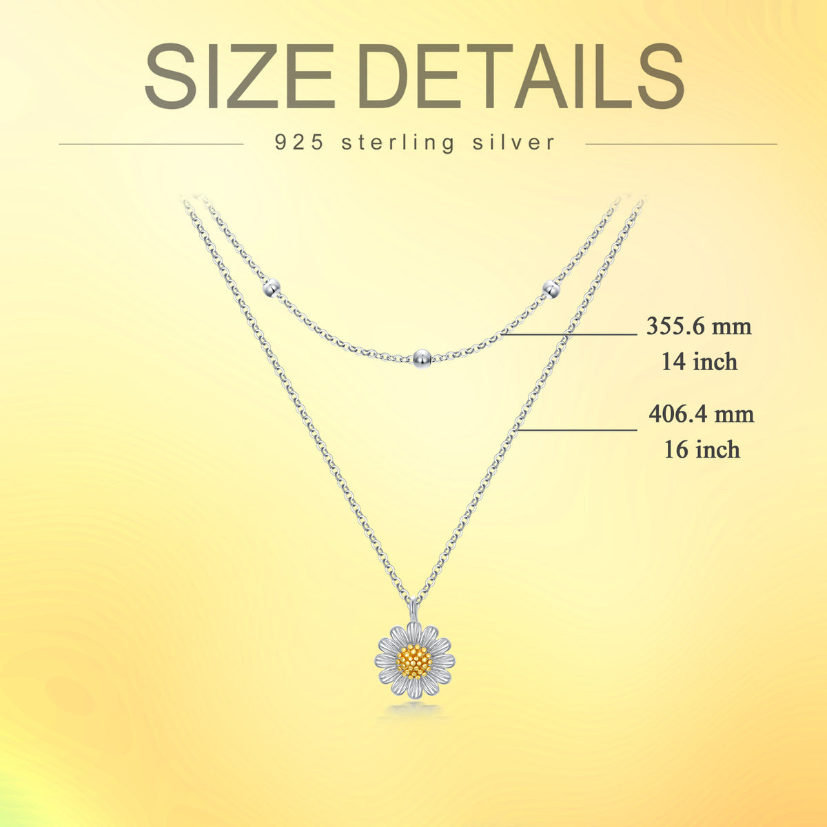 This Sterling Silver Two-tone Sunflower Layered Necklace by YFN is a stone-free Layered Necklace adorned with a Sunflower design in both White Gold and Yellow Gold finishes. Combining the classic allure of sterling silver with captivating color contrast, it offers unmatched versatility and chic style.