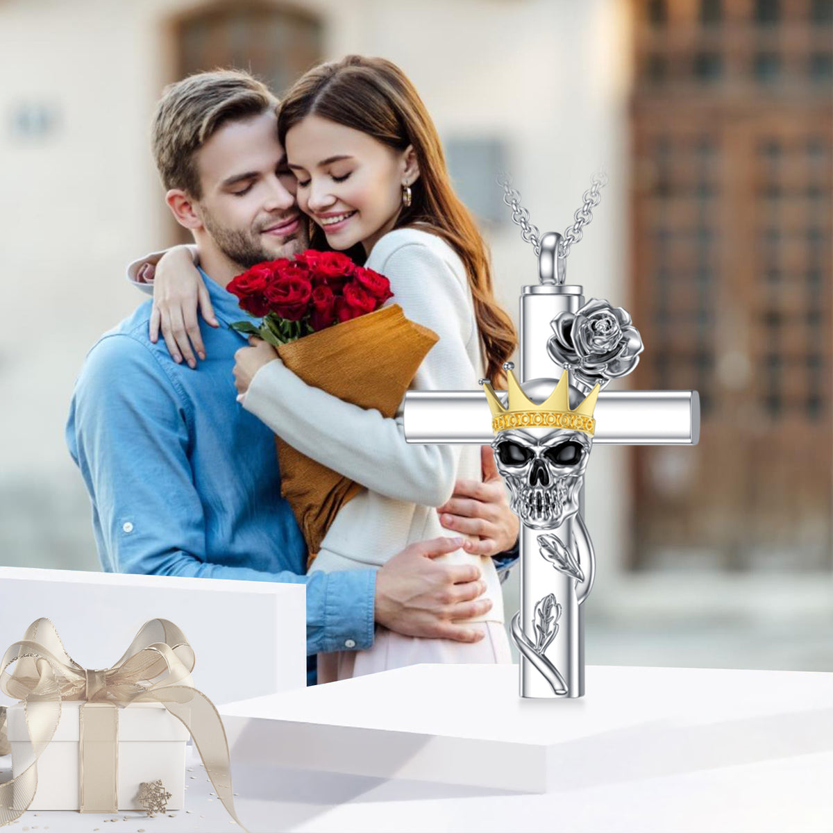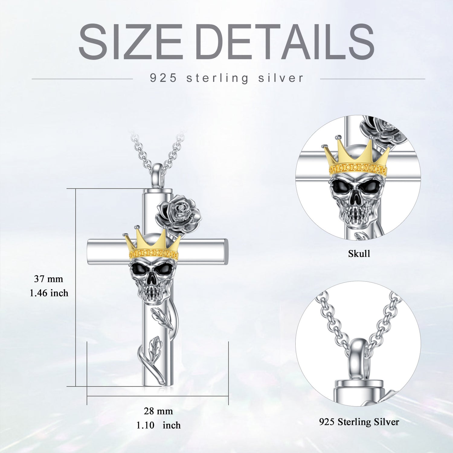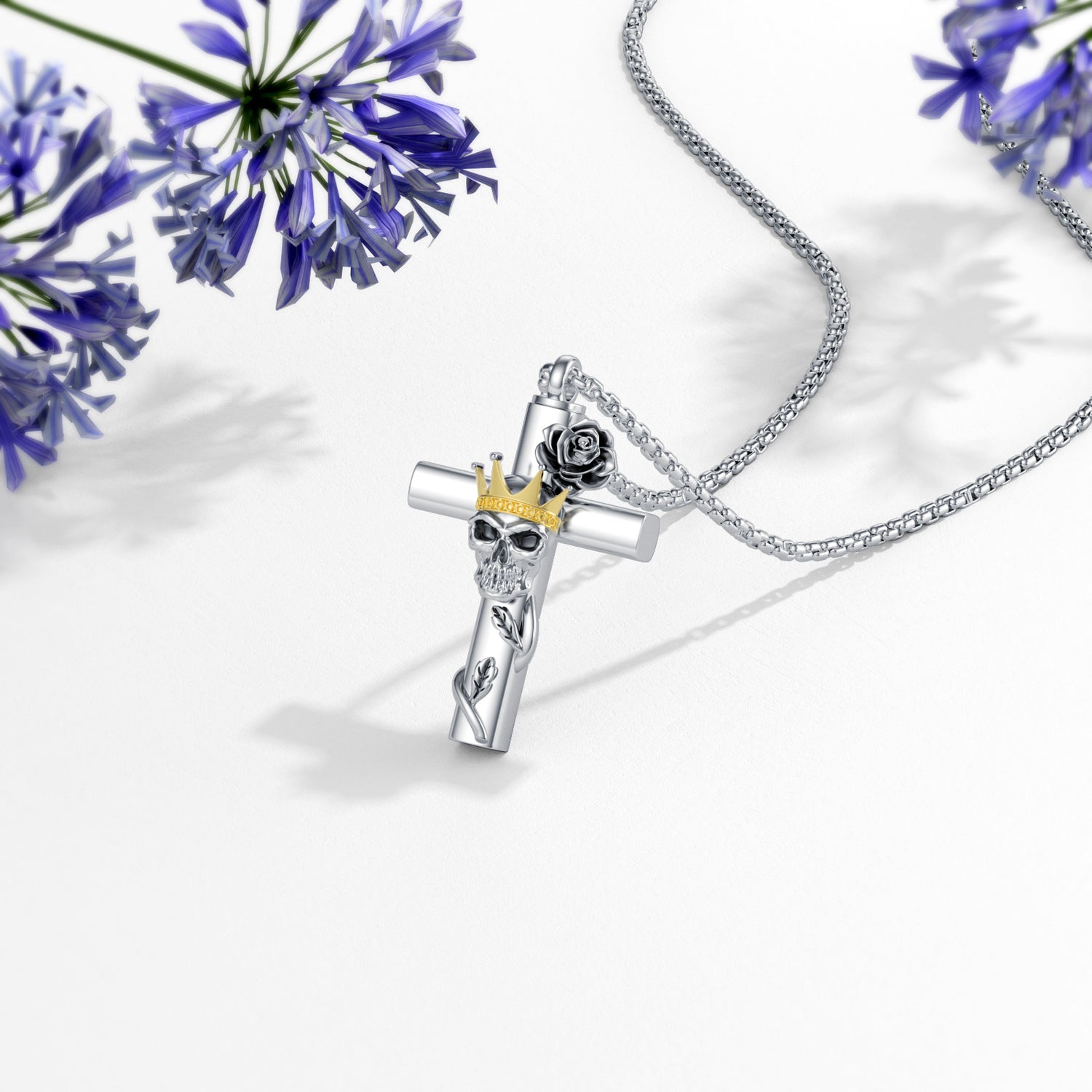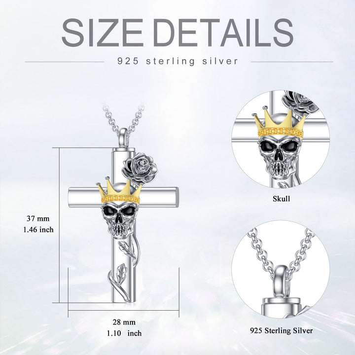 Crafted from sterling silver with white gold or yellow gold plating (two-tone options). Designed as an urn necklace for ashes. Features rose, cross, crown, and skull motifs. Stone-free design.