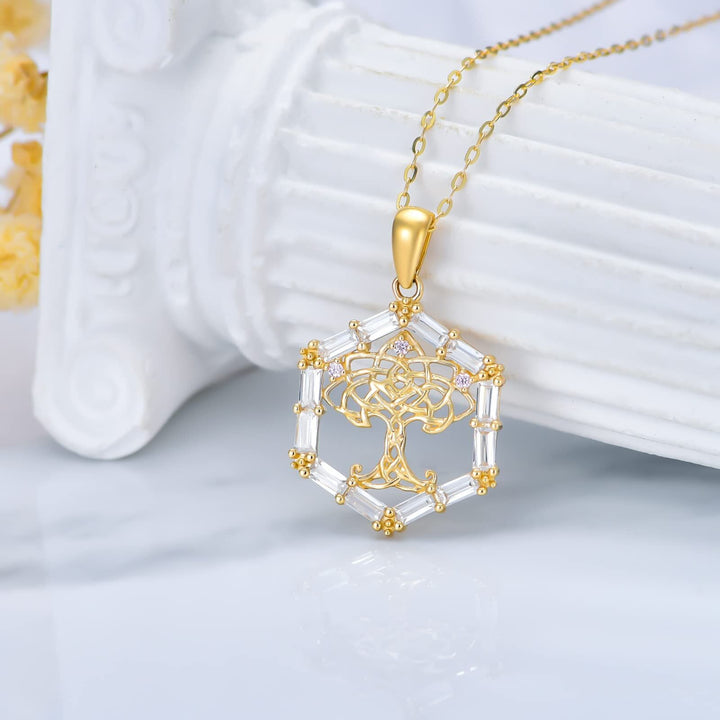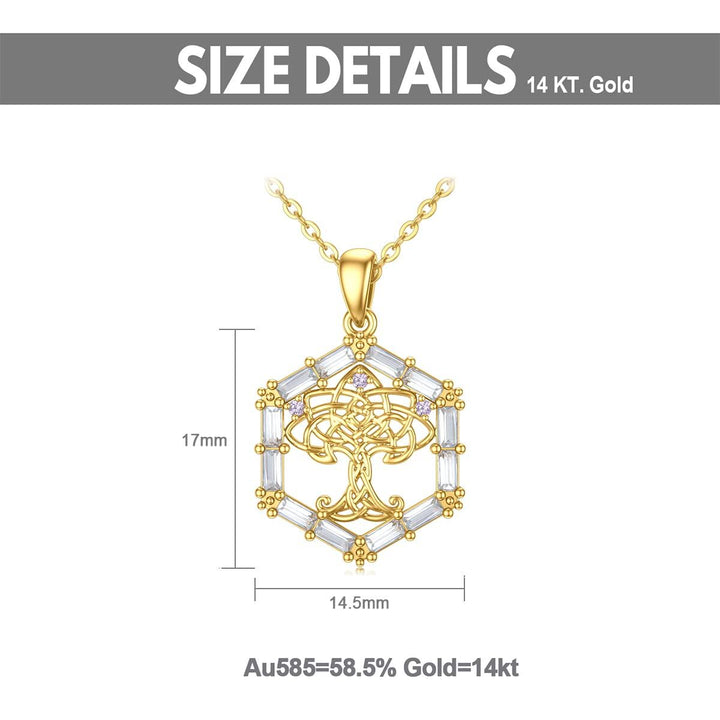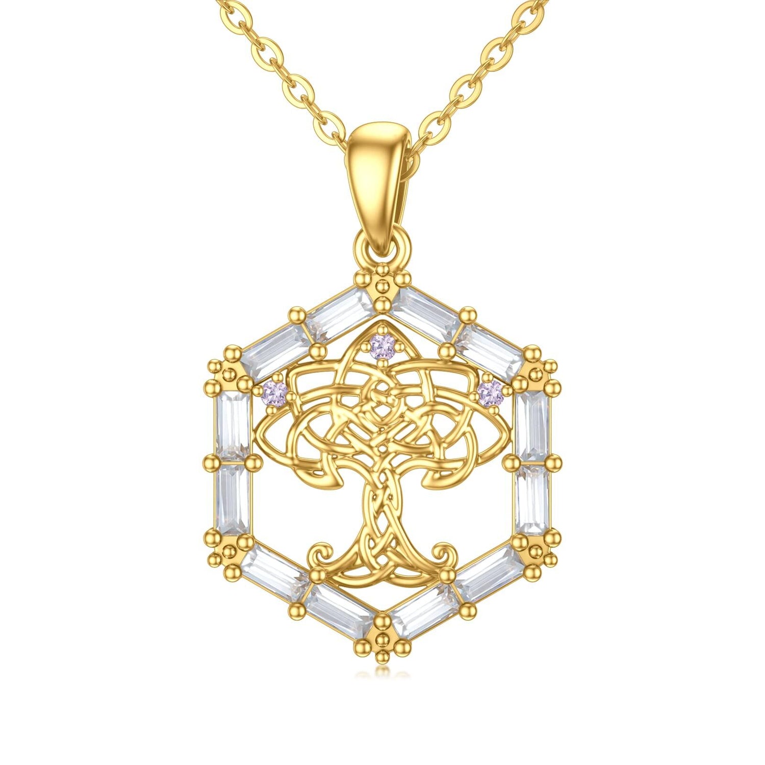 9K Gold Round Cubic Zirconia Tree Of Life & Celtic Knot Pendant Necklace