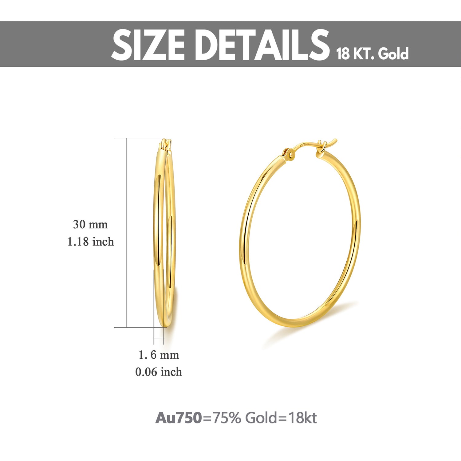 These no-stone Women's Hoop Earrings (30mm Round) are crafted from pure 18K Gold.