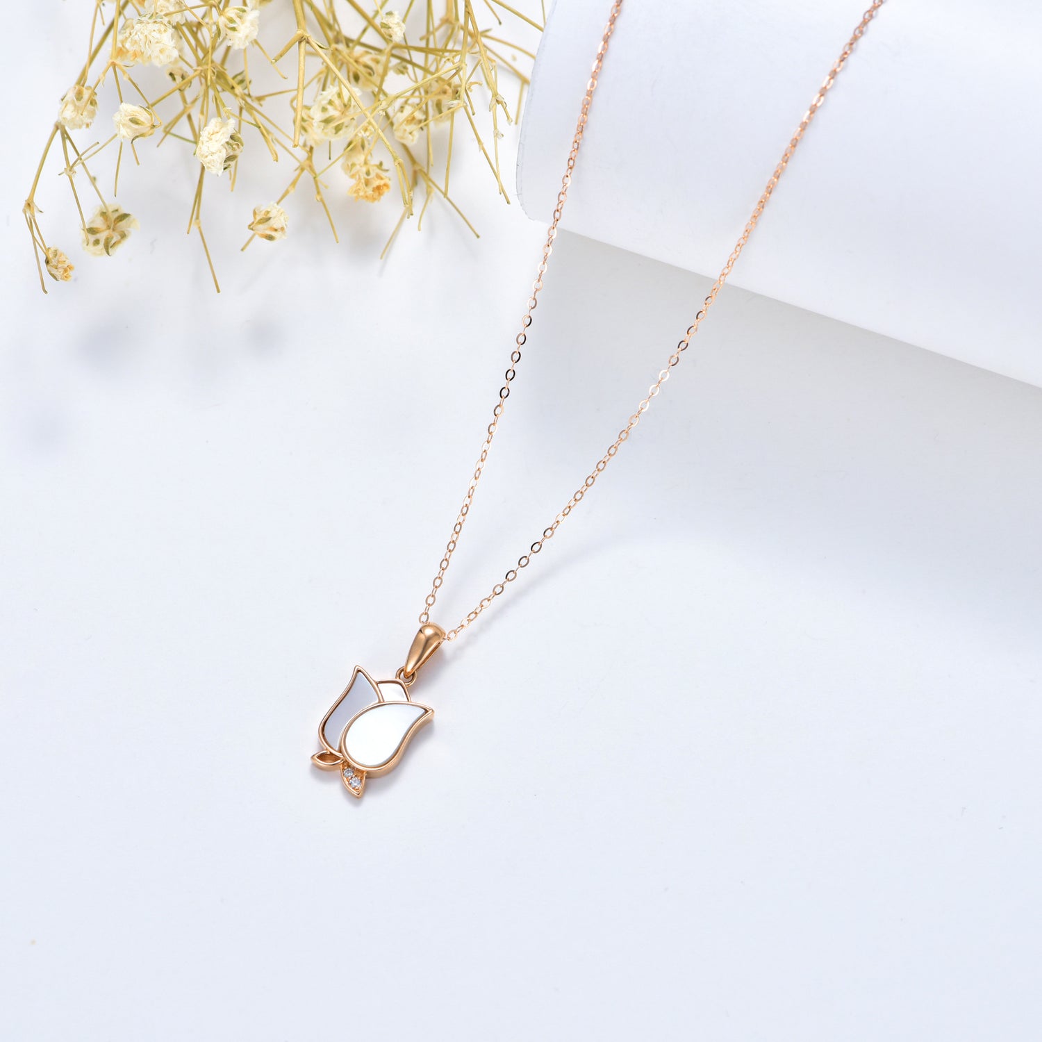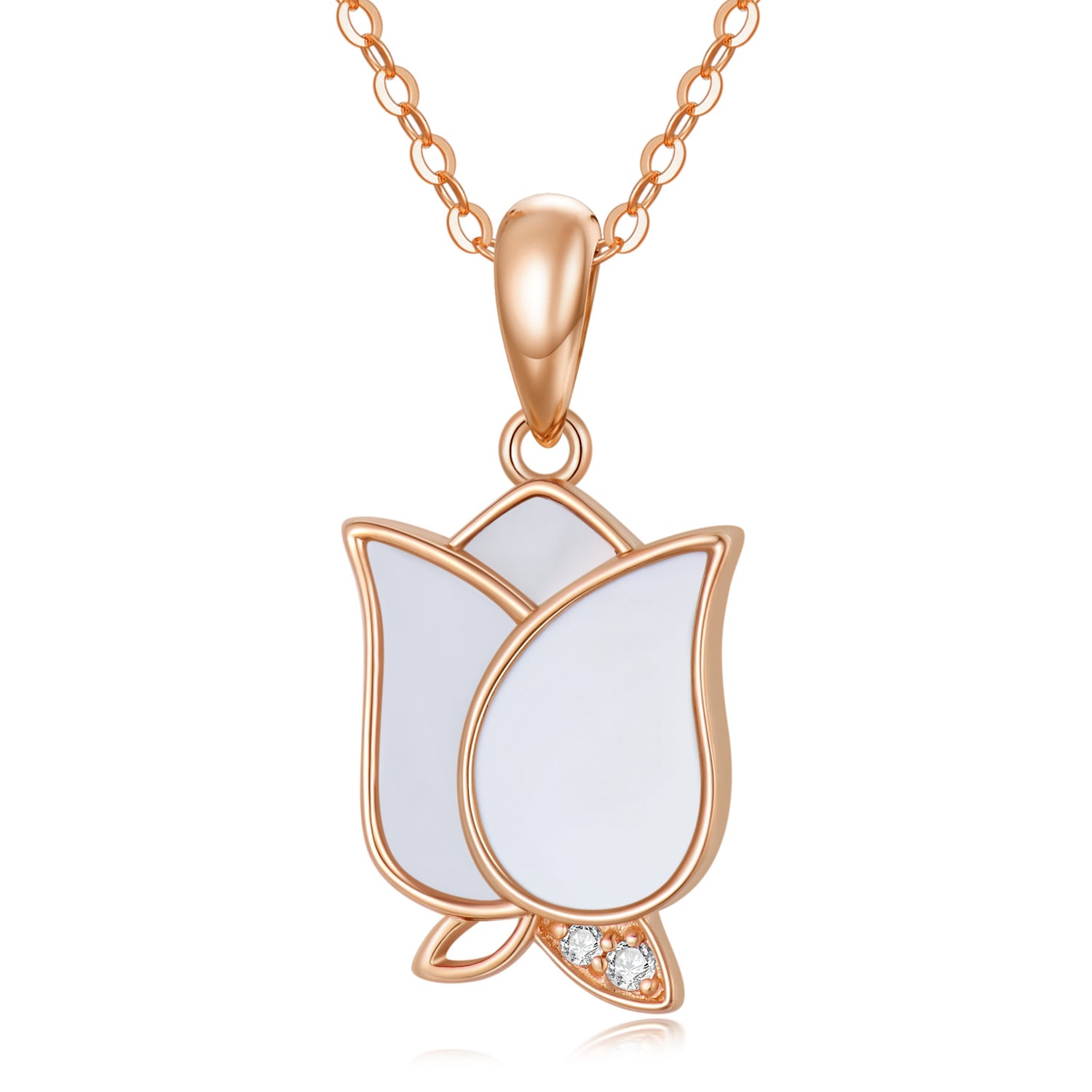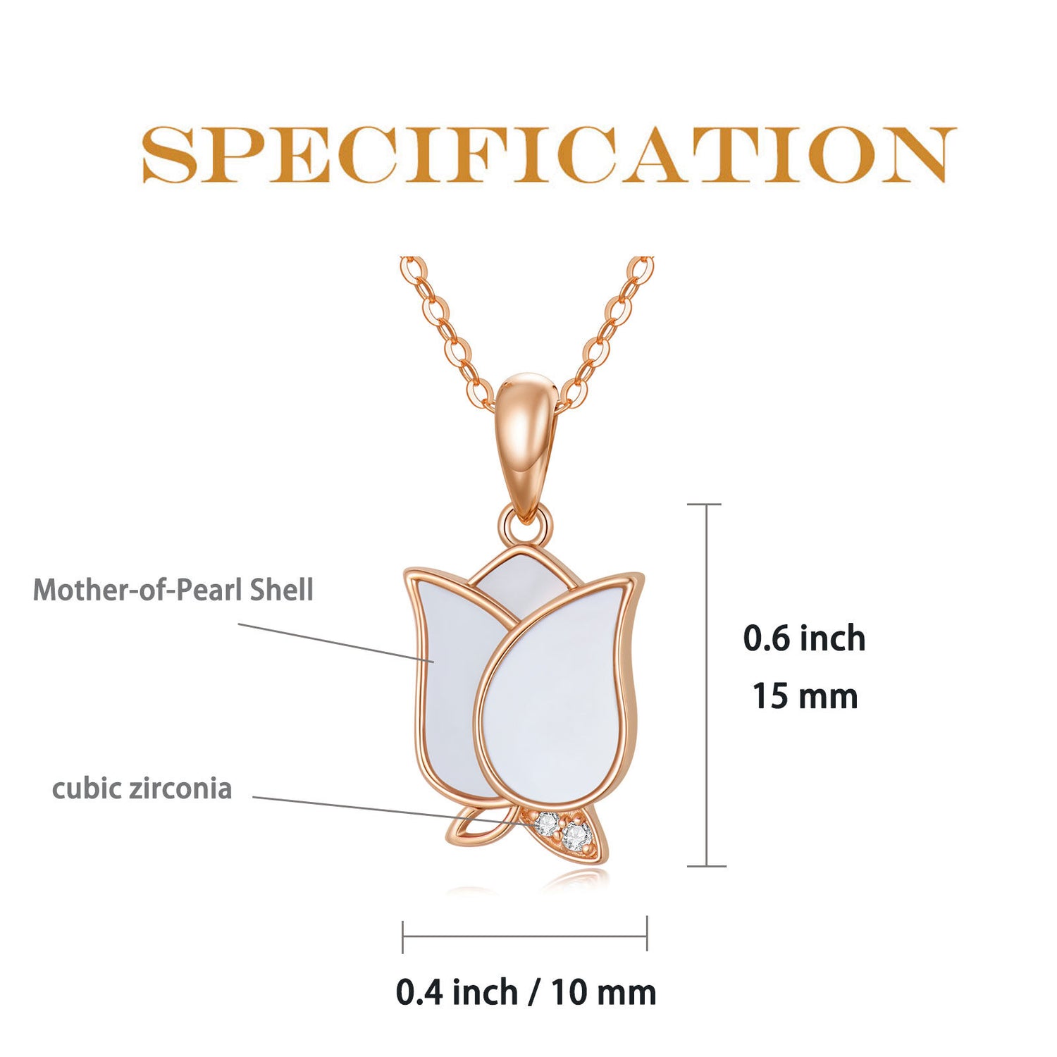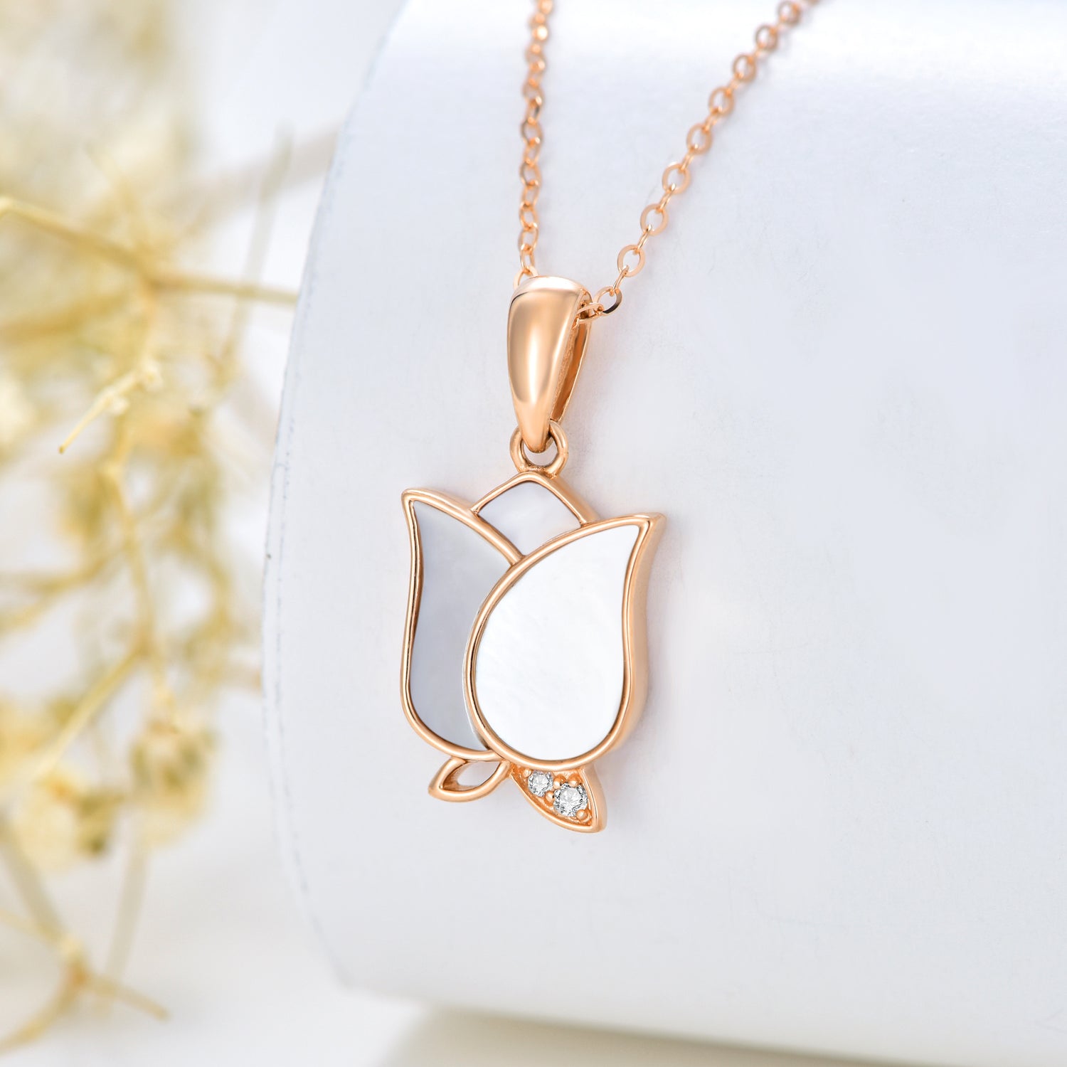 This 14K Rose Gold Rose Flower Pendant Necklace Jewelry Gift For Her by YFN is an exquisite piece that combines luxury and femininity for women. This Pendant Necklace is crafted from high-quality 14K Gold with a romantic Rose Gold finish. It features a delicate Rose Motif with a flawless Round Mother of Pearl centerpiece surrounded by sparkling Cubic Zirconia that catch the light with every movement.