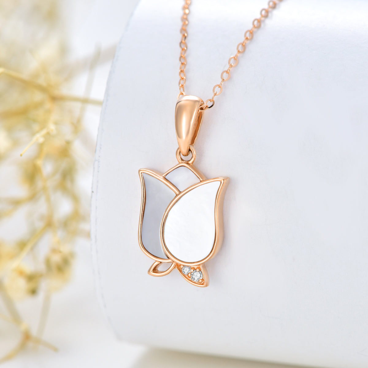 This Pendant Necklace is crafted from 14K Gold with a Rose Gold finish, featuring a Rose Motif, a Round Mother of Pearl centerpiece, and sparkling Cubic Zirconia.